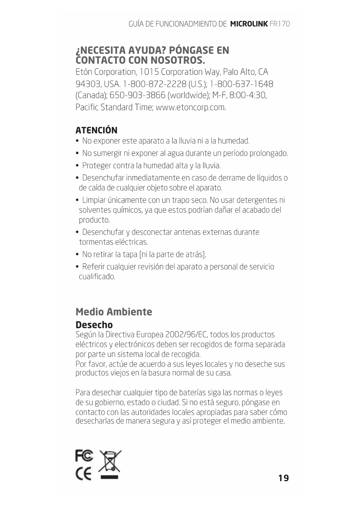 CONTACTO CON NOSOTROS. Etón Corporation, 1015 Corporation Way, Palo Alto, CA 94303, USA. 1-800-872-2228 (U.S.); 1-800-637-1648 (Canada); 650-903-3866 (worldwide); M-F, 8:00-4:30, Pacic Standard Time; www.etoncorp.com. ATENCIÓN