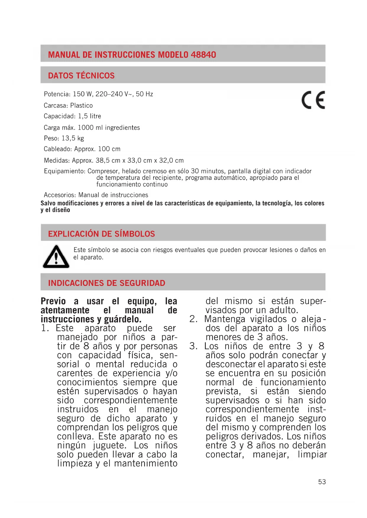 DISPOSICIÓN/PROTECCIÓN DEL MEDIO AMBIENTE Nuestros aparatos se fabrican con un alto nivel de calidad por un largo período de uso. El mantenimiento regular y las reparaciones de tipo técnico a través de nuestro servicio al cliente pueden prolongar la du- ración del aparato. Cuando un aparato está defectuoso y ya no puede repararse, por favor considere en la disposición final los siguientes puntos: Este producto no puede ser eliminado junto a la basura domiciliaria. Usted debe entregar este producto a un lugar oficial para el reciclaje de aparatos eléctricos o electrónicos. Mediante la clasificación por separado y el reciclaje de productos residuales, Usted contribuye a proteger los recursos naturales y asegura que el producto sea eliminado de forma salubre y acorde con el medio ambiente. Deje enfriar la masa en el frigorífico durante 24 horas, elaborando después el helado en la heladera. CONSEJO: Añada al final 1 C. de Lacasitos u ositos de goma para los niños. Helado de vainilla rápido 100 ml de leche, 300 ml de nata, 1 huevo, 3 C. de azúcar, 10 – 20 g de vainilla azucarada Mezcle bien todos los ingredientes y elabore el helado en la heladera. Receta básica helado de chocolate ½ tableta de chocolate negro, ½ tableta de chocolate con leche, 250 ml de nata, 50 ml de leche, 1 huevo Lleve a ebullición el chocolate y la leche y deje enfriar la masa en el frigorífico durante 24 horas. A continuación, añada 1 huevo a la masa y ela-bore el helado en la heladera. Helado de chocolate rápido 150 ml de sirope de chocolate, 1 huevo, 150 ml de nata, 150 ml de leche Mezcle bien todos los ingredientes y elabore el helado en la heladera. Helado de Moca Prepare un helado de vainilla según la receta básica, pero disolviendo 2 – 3 C. de moca o café soluble en la leche caliente previo a la elaboración. Hacia el final del proceso de congelación, añada 1 – 2 C. de licor de café. Helado de nueces Caramelice 50 g de azúcar en una sartén, añada 50 g de nueces bien picadas y mezcle bien los ingredientes. Deje que la masa se enfríe en una tabla aceitada. Pique el crocante. Prepare un helado de vainilla según la receta básica, sustituyendo el azúcar por miel del bosque. Hacia el final del proceso de congelación, añada el crocante de nueces bien picado. Helado de Amaretto Prepare un helado de vainilla según la receta básica. Mezcle 100 g de Amaretti con 2 – 3 C. de Amaretto y añada estos ingredientes hacia el final del proceso de congelación. La garantía para nuestros equipos es de 24 meses, y de 12 meses en el caso de uso comercial, a partir de la fecha de compra, cubriendo los daños que con un uso acorde a lo prescrito pueden atribuirse fehacientemente a defectos de fabricación. Dentro del período de garantía, solucionamos errores de material y de fabricación a consideración nuestra mediante reparación o cambio. Nuestros servicios de garantía son válidos únicamente para los aparatos que han sido vendidos en Alemania y Austria. Para todos los demás casos diríjase por favor al importador correspondiente. Aquellos aparatos que se presentan para eliminar errores, por favor enviarlos junto a una copia del comprobante de compra extendido a máquina, del cual debe desprenderse la fecha de compra, así como una breve descripción de las deficiencias, apropiadamente embalado y con los sellos correspondientes a nuestro servicio al cliente. En caso de garantía, los gastos de envío serán restituidos al cliente solamente en Alemania y Austria. Aquellos daños causa- dos por desgaste están excluidos de la garantía, así como manipulación incorrecta, e incumplimiento de las condiciones de mantenimiento y cuidado. El derecho a garantía expira si las reparaciones o mantenimiento son realizadas por terceros. Todo reclamo del consumidor final ante el vendedor, comerciante no se ve afectado por esta garantía.59 Výkon: 150 W, 220–240 V~, 50 Hz Objem: 1,5 litr Max. plnící množství: 1.000 ml Velikost: D/Š/V 38,5 cm x 33,0 cm x 32,0 cm Hmotnost: Cca 13,5 kg Přívod: Cca 100 cm Vybavení: Provoz kompresoru, smetanová krémová zmrzlina za pouhých 30 minut, digitální ukazatel sindikací teploty nádoby na zmrzlinu, automatický program, vhodné pro trvalý provoz Příslušenství: Návod k obsluze Je vyhrazeno právo na omyly a změny vybavení, techniky, barev a designu.