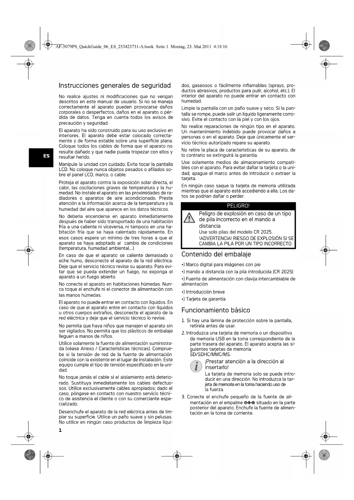 mentación en el empalme Í situado en la parte posterior del aparato. Enchufe la fuente de alimen- tación en la toma de corriente. PELIGRO! Peligro de explosión en caso de un tipo de pila incorrecto en el mando a distancia Use solo pilas del modelo CR 2025. !ADVERTENCIA! RIESGO DE EXPLOSIÓN SI SE CAMBIA LA PILA POR UN TIPO INCORRECTO. ¡Prestar atención a la dirección al insertarlo! La tarjeta de memoria solo se puede intro- ducir en una dirección. No introduzca la tar- jeta de memoria en la toma haciendo uso de la fuerza. AF-5079PS_QuickGuide_06_ES_253423731-A.book Seite 1 Montag, 23. Mai 2011 4:18 162