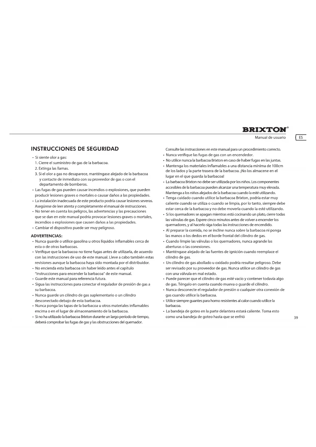 - La bandeja de goteo en la parte delantera estará caliente. Toma esto como una bandeja de goteo hasta que se enfrió ES40 NO APTO PARA USO COMERCIAL! INFORMACIÓN DE SEGURIDAD: ADVERTENCIA: La barbacoa está diseñada para ser utilizada con gas, según se indica en la placa. Nunca utilice otros gases en la barbacoa. La no observancia de esta advertencia podría causar un incendio y lesiones corporales. Además se anulará la garantía. ADVERTENCIA: Nunca almacene cilindros de gas de seguridad debajo o cerca de la barbacoa. No llene el cilindro de gas más del 80 por ciento; no cumplir estrictamente esta indicación podría causar un incendio y provocar lesiones mortales o graves. ADVERTENCIA: Mantenga los cables de alimentación y la manguera de combustible lejos de las supercies calientes. ADVERTENCIA: Nunca coloque la barbacoa Brixton bajo una zona resistente al calor o un protector solar. ADVERTENCIA: Esta barbacoa no está destinada para ser instalarla o colocada en una furgoneta o caravana, ni para ser instalada en un barco. ADVERTENCIA: Para su seguridad, nunca almacene o utilice gasolina u otros vapores combustibles o líquidos cerca de esta u otras barbacoas. La no observancia de esta advertencia puede causar incendios, explosiones y lesiones corporales.