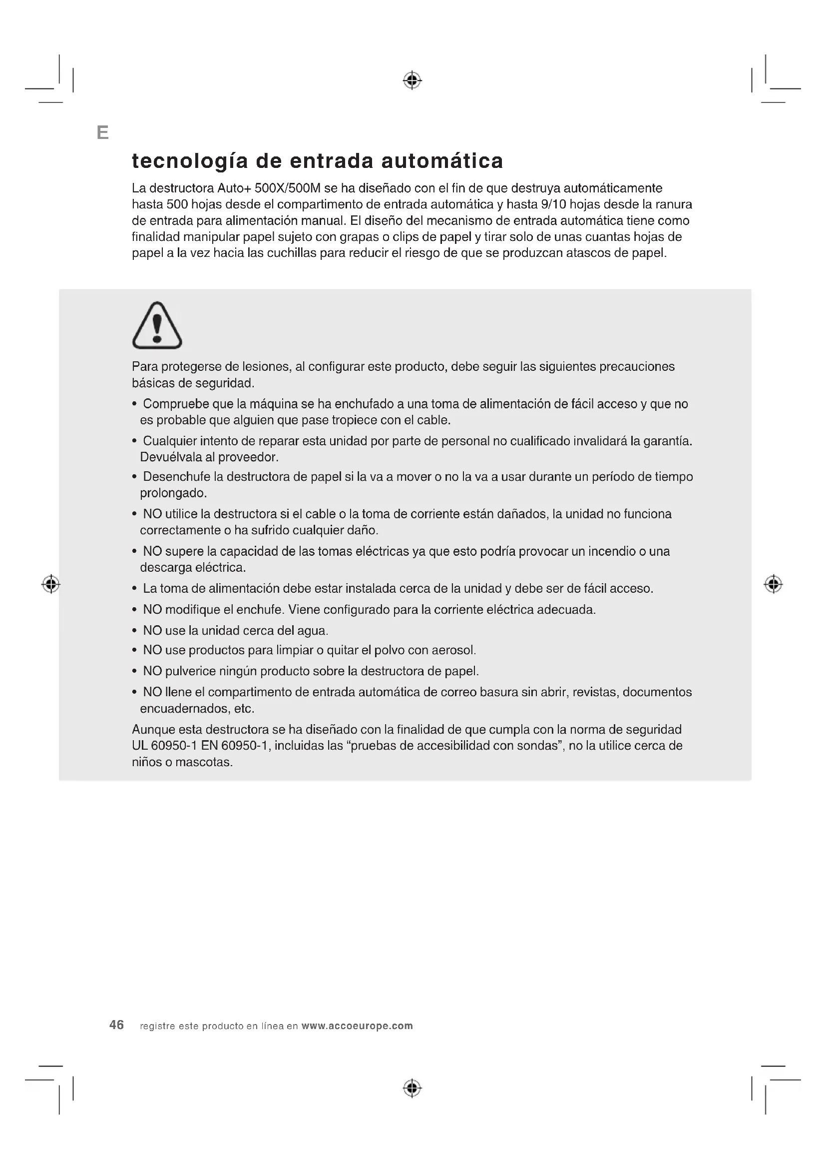 - NO llene el compartimento de entrada automática de correo basura sin abrir, revistas, documentos encuadernados, etc. Aunque esta destructora se ha diseñado con la nalidad de que cumpla con la norma de seguridad UL 60950-1 EN 60950-1, incluidas las “pruebas de accesibilidad con sondas”, no la utilice cerca de niños o mascotas. tecnología de entrada automática La destructora Auto+ 500X/500M se ha diseñado con el n de que destruya automáticamente hasta 500 hojas desde el compartimento de entrada automática y hasta 9/10 hojas desde la ranura de entrada para alimentación manual. El diseño del mecanismo de entrada automática tiene como nalidad manipular papel sujeto con grapas o clips de papel y tirar solo de unas cuantas hojas de papel a la vez hacia las cuchillas para reducir el riesgo de que se produzcan atascos de papel.AUTO+ 500X&500M