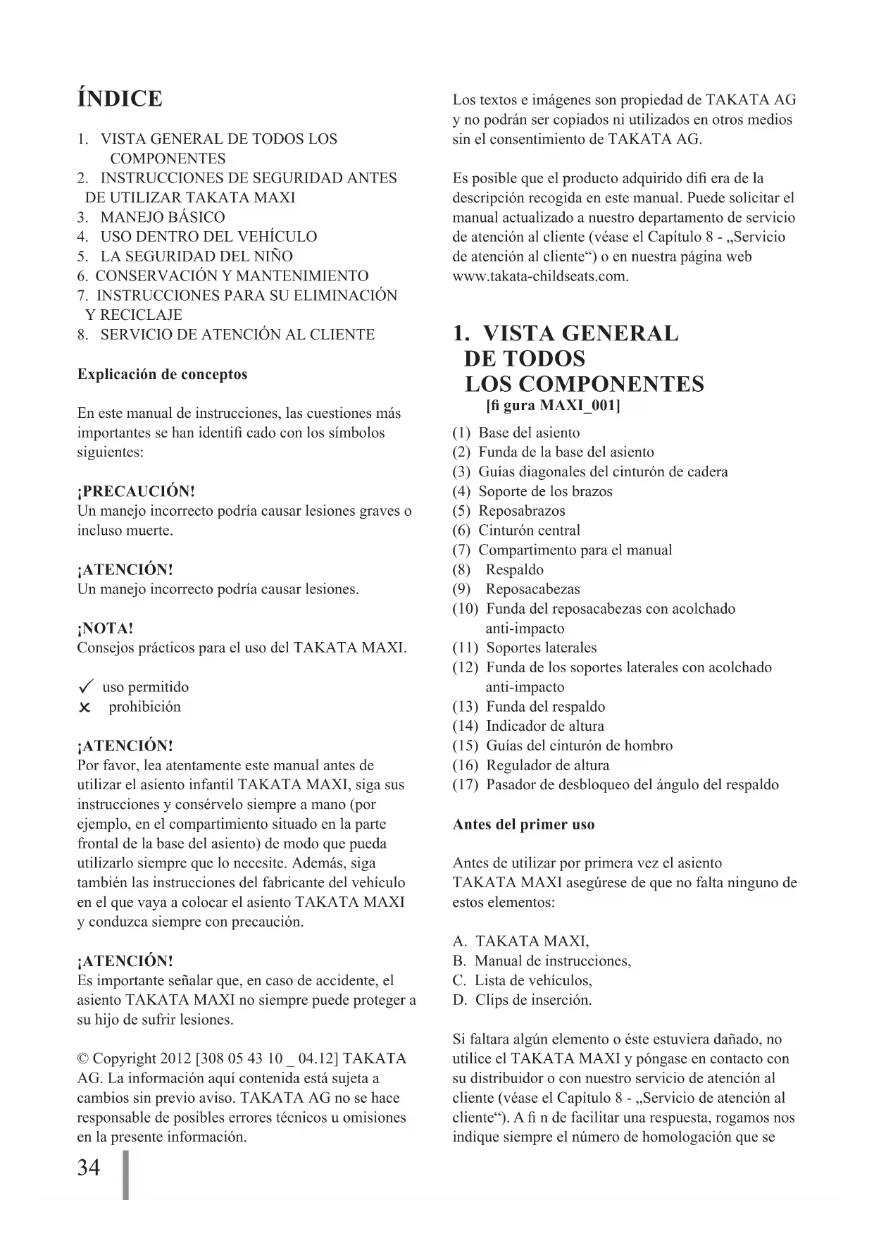 prohibición ¡ATENCIÓN! Por favor, lea atentamente este manual antes de utilizar el asiento infantil TAKATA MAXI, siga sus instrucciones y consérvelo siempre a mano (por ejemplo, en el compartimiento situado en la parte frontal de la base del asiento) de modo que pueda utilizarlo siempre que lo necesite. Además, siga también las instrucciones del fabricante del vehículo en el que vaya a colocar el asiento TAKATA MAXI y conduzca siempre con precaución. ¡ATENCIÓN! Es importante señalar que, en caso de accidente, el asiento TAKATA MAXI no siempre puede proteger a su hijo de sufrir lesiones. © Copyright 2012 [308 05 43 10 _ 04.12] TAKATA AG. La información aquí contenida está sujeta a cambios sin previo aviso. TAKATA AG no se hace responsable de posibles errores técnicos u omisiones en la presente información. Los textos e imágenes son propiedad de TAKATA AG y no podrán ser copiados ni utilizados en otros medios sin el consentimiento de TAKATA AG. Es posible que el producto adquirido difi era de la descripción recogida en este manual. Puede solicitar el manual actualizado a nuestro departamento de servicio de atención al cliente (véase el Capítulo 8 - „Servicio de atención al cliente“) o en nuestra página web www.takata-childseats.com.
