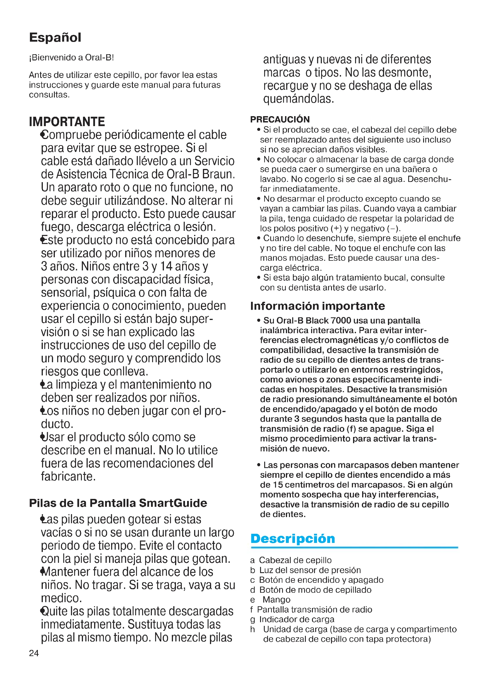 que ayudan a indicar cuando es necesario cambiar el cabezal. Con un profundo cepillado, dos veces al día durante dos minutos, los filamentos pierden el color azul hasta la mitad aproximadamente en 3 meses, indicando que es momento de cambiar el cabezal del cepillo. Si los filamentos pierden el color antes, significará que está ejerciendo demasiada presión sobre dientes y encías. No recomendamos el uso del cabezal de cepillo Oral-B FlossAction o Oral-B 3DWhite con ortodon- cias. En esos casos recomendamos usar el cabezal de cepillo Oral-B Ortho, diseñado específicamente para limpiar alrededor de ortodoncias. Sincronización del cepillo Para evitar interferencias de mensajes en la pantalla cuando en la misma casa se utiliza más de un cepillo Oral-B Black 7000 con pantallas SmartGuide separadas, deberá asignar los mangos a sus respectivas pantallas. Puede sincronizar un máximo de 2 mangos a cada pantalla SmartGuide. Para ello, pulse el botón «h/min» en el compartimento de la batería durante al menos 3 segundos. La pantalla SmartGuide muestra «L---». Encienda el mango para comenzar el proceso de sincronización. Finalizará cuando aparezca «L-1-». A continuación, apague el mango. Si desea asignar un segundo mango a la misma pantalla SmartGuide, encienda el otro mango hasta que aparezca «L-2-». Después de sincronizar el segundo mango, se mostrará «Full» (lleno). Puede salir del modo sincronización pulsando el botón «h/min» o «set», de lo contrario, finalizará auto- máticamente transcurridos 30 segundos. Recomendaciones de limpieza Después de cepillarse, aclare el cabezal del cepillo bajo el agua con el cepillo encendido. Después apague el cepillo y separe el cabezal del mango. Limpie ambas partes separadamente y séquelas antes de colocarlas de nuevo. Desmonte la base de carga antes de limpiarla. El compartimento de cabezales de cepillo y la tapa protectora son aptos para lavavajillas. La base de carga y la pantalla SmartGuide deben limpiarse con una toallita 92036479_D34_WE_7000_S6-68.indd 27 19.12.12 13:49 CSS APPROVED Effective Date 27Dec2012 GMT - Printed 05Mar2013 Page 26 of 6728 húmeda. Cuando limpie el estuche de viaje (m) saque la parte interior. Esta parte es apta para lavavajillas; la parte externa debe limpiarse sólo con una toallita húmeda (dibujo 5, página5). Asegúrese de que las partes están completamente secas antes de colocarlas en el estuche de viaje de nuevo. Aviso: Limpie las manchas de la superficie del estuche de viaje inmediatamente. Guárdelo en un sitio limpio y seco. Soporte de pared Use la cinta adhesiva (l) con el soporte de pared (k) si prefiere montar la pantalla SmartGuide sobre una pared, un espejo u otra superficie. Compruebe que la superficie elegida está limpia y seca antes de colocarlo. Pegue la cinta adhesiva en la parte lisa del soporte de pared y presiónelo uniforme y firmemente contra la pared. Espere 24 horas antes de deslizar la pantalla SmartGuide en el soporte (j). Colocar la pantalla en el soporte (dibujo C, página 4). La cinta adhesiva no funcionará sobre superficies anti-suciedad. Sujeto a modificaciones sin previo aviso. Este producto cumple con las normas de la Directiva Europea 1999/5/EC. Clase de receptor 3, Clase de ciclo de trabajo 3. Para consultar la declaración de conformidad completa por favor visite www.oralb.com/ce. Aviso medioambiental Este producto contiene pilas recargables. Para preservar el medioambiente, no tire el producto directamente a la basura cuando finalice su vida útil. Puede dejarlo en un Servicio Técnico de Oral-B Braun o en uno de los puntos de recogida de su país previstos para tal fin. Garantía Aseguramos 2 años de garantía desde el día de la compra del producto. Dentro del periodo de garantía solucionaremos sin ningún cargo cualquier defecto resultante de fallos en el material y/o en la fabricación. Esto lo haremos, dependiendo del caso, reparando la unidad o reemplazándola por una nueva. Esta garantía es aplicable a todos los países en los que se vendan los productos Braun. Esta garantía no cubre los desperfectos causados en los siguientes casos: Uso inapropiado, desgaste normal por uso, especialmente en lo relativo a los cabezales del cepillo, así como uso negligente del mismo. La garantía se invalida si la reparación es llevada a cabo por personas no autorizadas o por el uso de elementos que no sean Braun. Para acceder al servicio durante el periodo de garantía, por favor entregue o envíe su cepillo completo así como la factura a un servicio postventa autorizado Oral-B Braun. Garantía en la reposición de cabezales de cepillo La garantía de Oral-B quedará anulada si el fallo en el mango del cepillo se debe al uso de cabezales de cepillo que no sean de Oral-B. Oral-B no recomienda el uso de cabezales de cepillo de otras marcas.