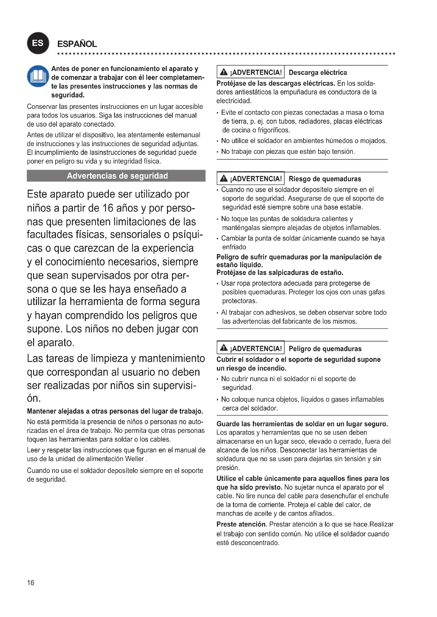 ón. Mantener alejadas a otras personas del lugar de trabajo. No está permitida la presencia de niños o personas no auto- rizadas en el área de trabajo. No permita que otras personas toquen las herramientas para soldar o los cables. Leer y respetar las instrucciones que guran en el manual de uso de la unidad de alimentación Weller . Cuando no use el soldador deposítelo siempre en el soporte de seguridad. ¡ADVERTENCIA! Descarga eléctrica Protéjase de las descargas eléctricas. En los solda- dores antiestáticos la empuñadura es conductora de la electricidad.