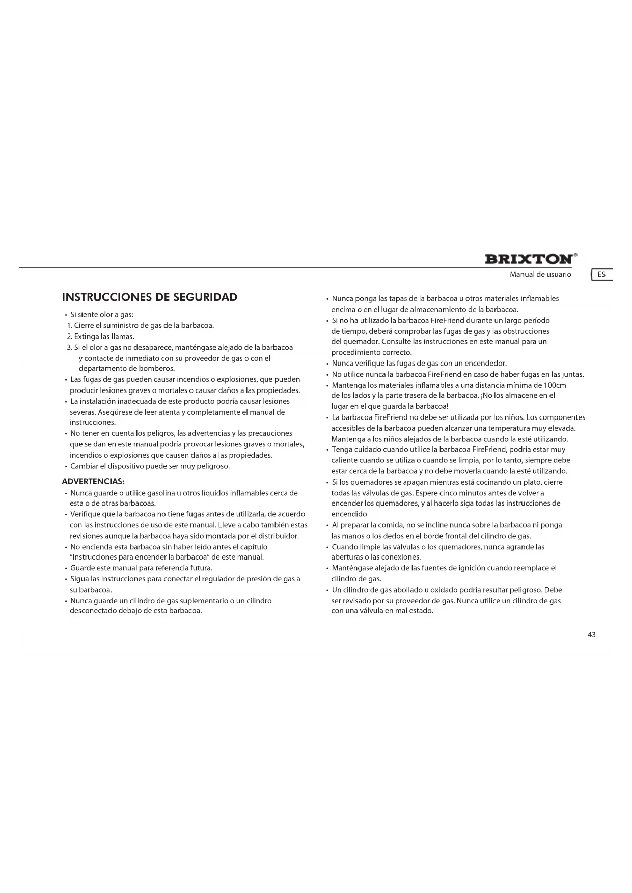 nota: El exterior de la carne se asará en la parrilla caliente, manteniendo jugoso el interior. Cuanto más se precaliente la barbacoa, más rápidamente se asará la carne. Manual de usuario ES52 garantÍa barbaCoa De gas Garantizamos al cliente o comprador de cualquier barbacoa de gas Brixton que, cuando se utilice para nes domésticos normales, esta barbacoa no tendrá defectos materiales ni de producción para el período que se estipula a continuación. Las parrillas alquiladas o las utilizadas con nes comerciales están excluidas de esta garantía. Los costes de envío y entrega de piezas de garantía corren de su cuenta. pieza perÍoDo Quemadores: 1 Año Parrilla: 1 Año Llaves: 1 Año Armazón, Carcasa, Tapa, Panel de control, Encendedor y Piezas similares: 1 Año Todas las piezas de acero inoxidable: 1 Año Todas las piezas de acero inoxidable: 1 Año Nuestra obligación bajo esta garantía se limita a la reparación o sustitución, según nuestro criterio, del producto durante el período de garantía. El alcance de nuestra responsabilidad bajo esta garantía se limita a la reparación y la sustitución. Esta garantía no cubre el desgaste normal de las piezas, o los daños que resulten de lo siguiente: la negligencia o mal uso del producto, el uso con suministro de combustible o gas inadecuado, una utilización que no cumpla las instrucciones de uso, o los ajustes realizados por cualquier persona que no pertenezca al centro de servicio de nuestra fábrica. El período de garantía no se extenderá por las reparaciones o sustituciones antes mencionadas. pregUntas FreCUentes y respUestas Dónde puedo comprar un cilindro de gas, autorizado y adecuado para la barbacoa FireFriend? En su proveedor local de gas o en las grandes tiendas de camping. Puedo dejar la barbacoa fuera en cualquier condición climática? Se recomienda guardar su barbacoa después de utilizarla en un lugar seco y bien ventilado. Siempre desconecte el cilindro de gas de acuerdo a las instrucciones que se dan en este manual. También puede comprar una cubierta protectora. Estos están disponibles en su punto de venta. Qué hacer si después de abrir el embalaje, faltan piezas de la barbacoa o están dañadas? Contacte con Tristar (T +31 (0) 13 – 594 0351, service@tristar.eu) que le ayudarán. Puedo utilizar simultáneamente la barbacoa y quemador lateral? Sí, esta barbacoa está especícamente diseñada para utilizar de manera simultánea el quemador principal y el quemador lateral. Puedo lavar la parrilla y/o las bandejas para horno en el lavavajillas? Es posible, sin embargo, basta con limpiarlas con un producto de limpieza para barbacoa o con agua jabonosa. Que hacer si la grasa se ltra por debajo de la barbacoa y/o en la base? Limpie la barbacoa y la base. Coloque la barbacoa sobre una supercie plana o recta. También asegúrese de vaciar regularmente la bandeja de goteo de grasa.53 instrUÇÕes De segUranÇa perigo: