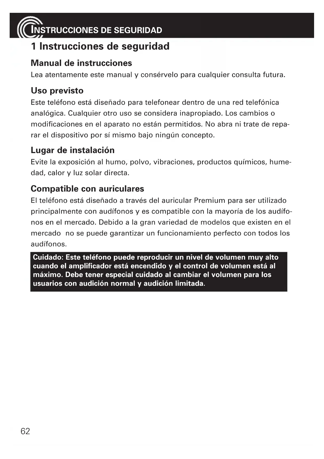 Cuidado: Este téléphone suece reproducir un nivel de volumen muy alto cuando el amplificador está encendido y el control de volumen está al máximo. Debe tener especial cuidado al cambiar el volumen para lososexuales con audicion normal y audicion limitada.