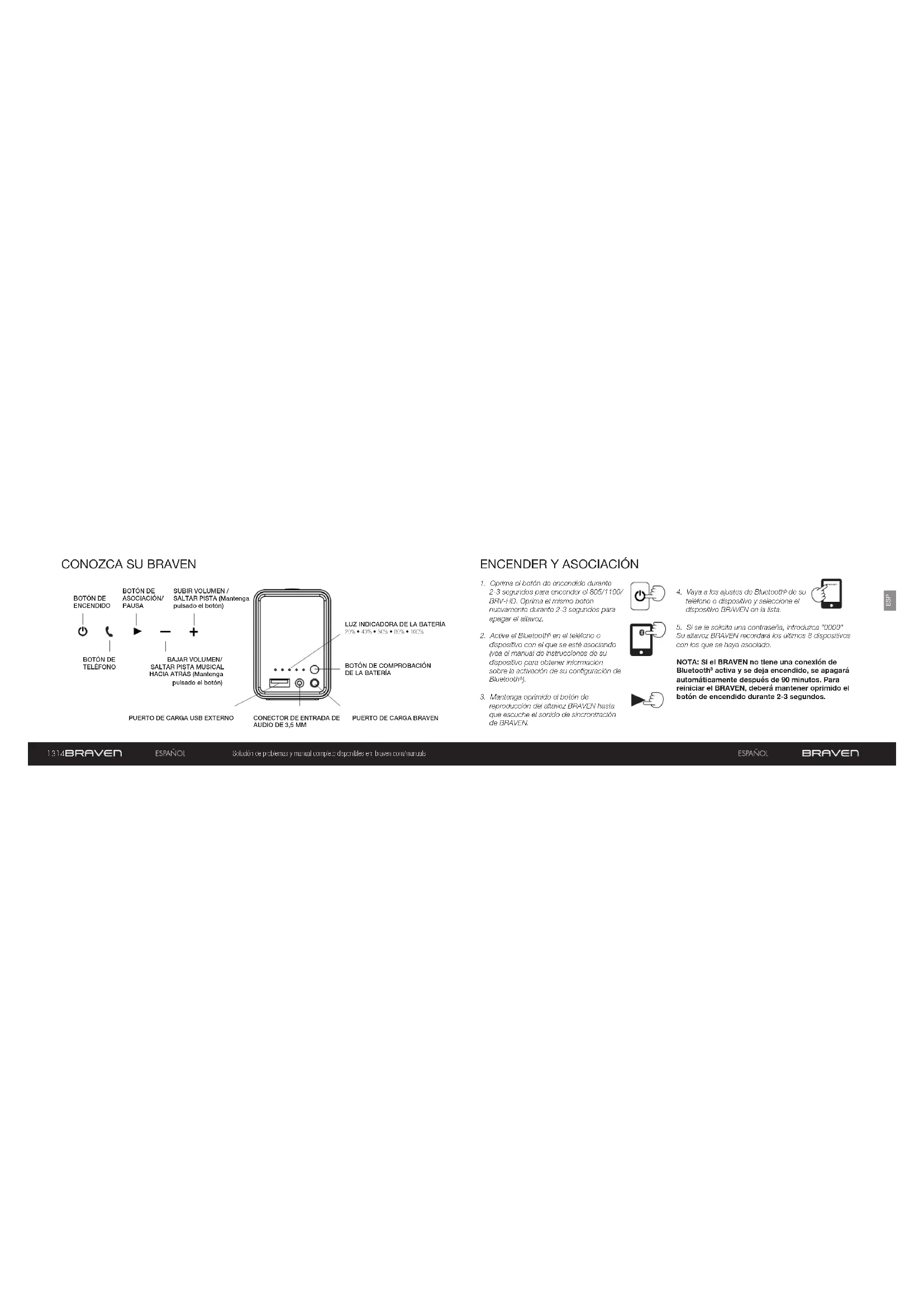 activa y se deja encendido, se apagará automáticamente después de 90 minutos. Para reiniciar el BRAVEN, deberá mantener oprimido el botón de encendido durante 2-3 segundos.15 16 ESP Solución de problemas y manual completo disponibles en: braven.com/manuals