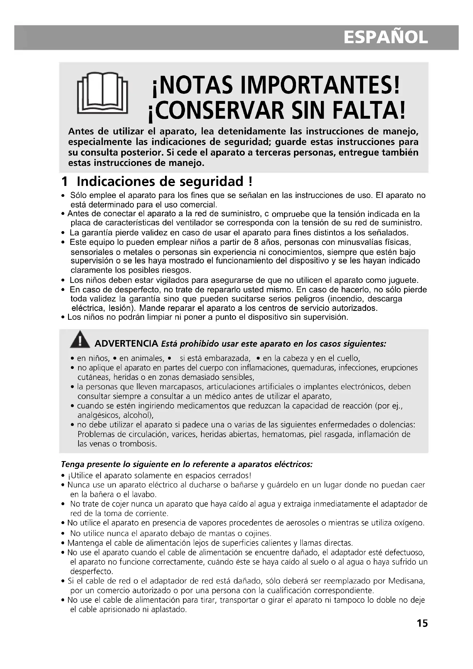 ¡NOTAS IMPORTANTES! ¡CONSERVAR SIN FALTA! Antes de utilizar el aparato, lea detenidamente las instrucciones de manejo, especialmente las indicaciones de seguridad; guarde estas instrucciones para su consulta posterior. Si cede el aparato a terceras personas, entregue también estas instrucciones de manejo. ESPAÑOL 1 Indicaciones de seguridad !