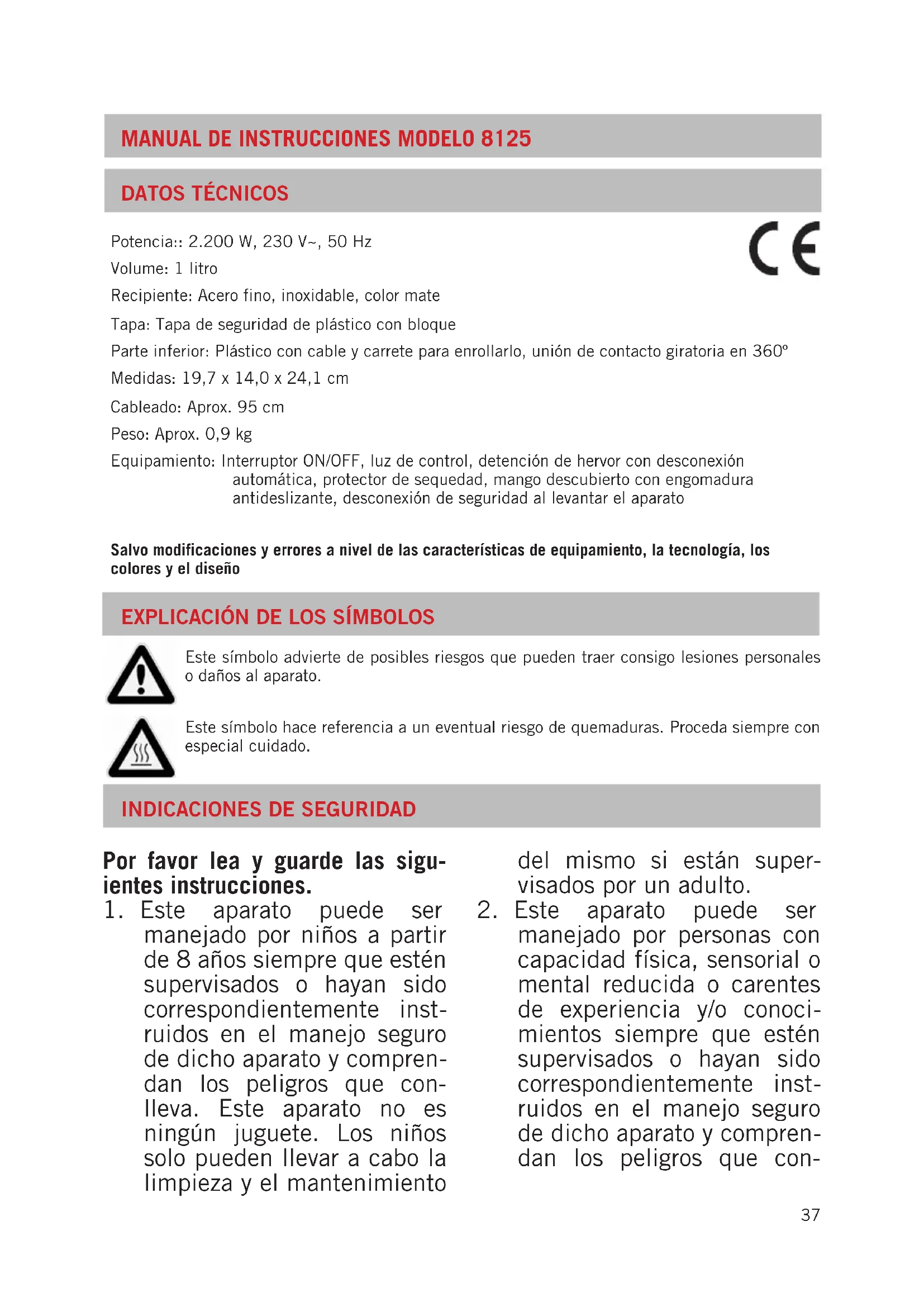 DISPOSICIÓN/PROTECCIÓN DEL MEDIO AMBIENTE Nuestros aparatos se fabrican con un alto nivel de calidad por un largo período de uso. El mantenimiento regular y las reparaciones de tipo técnico a través de nuestro servicio al cliente pueden prolongar la du- ración del aparato. Cuando un aparato está defectuoso y ya no puede repararse, por favor considere en la disposición final los siguientes puntos: Este producto no puede ser eliminado junto a la basura domiciliaria. Usted debe entregar este producto a un lugar oficial para el reciclaje de aparatos eléctricos o electrónicos. Mediante la clasificación por separado y el reciclaje de productos residuales, Usted contribuye a proteger los recursos natu- rales y asegura que el producto sea eliminado de forma salubre y acorde con el medio ambiente. La garantía para nuestros equipos es de 24 meses, y de 12 meses en el caso de uso comercial, a partir de la fecha de compra, cubriendo los daños que con un uso acorde a lo prescrito pueden atribuirse fehacientemente a defectos de fabricación. Dentro del período de garantía, solucionamos errores de material y de fabricación a consideración nuestra mediante reparación o cambio. Nuestros servicios de garantía son válidos únicamente para los aparatos que han sido vendidos en Alemania y Austria. Para todos los demás casos diríjase por favor al importador correspondiente. Aquellos aparatos que se presentan para eliminar errores, por favor enviarlos junto a una copia del comprobante de compra extendido a máquina, del cual debe desprenderse la fecha de compra, así como una breve descripción de las deficiencias, apropiadamente embalado y con los sellos correspondientes a nuestro servicio al cliente. En caso de garantía, los gastos de envío serán restituidos al cliente solamente en Alemania y Austria. Aquellos daños causa- dos por desgaste están excluidos de la garantía, así como manipulación incorrecta, e incumplimiento de las condiciones de mantenimiento y cuidado. El derecho a garantía expira si las reparaciones o mantenimiento son realizadas por terceros. Todo reclamo del consumidor final ante el vendedor, comerciante no se ve afectado por esta garantía.Výkon: 2.200 W, 230 V~, 50 Hz Objem: 1 litr Nádoba: Nerezová ocel Víko: Bezpečnostní plastové víko se zajištěním Spodní část: Plast s kabelem a navíjením kabelu, o 360° otočné spojení kontaktů Rozměry: 19,7 x 14,0 x 24,1 cm Přívod: Cca. 95 cm Hmotnost: Cca. 0,9 kg Vybavení: Spínač ZAP/VYP, kontrolka, zastavení vaření s automatikou vypnutí, ochrana proti „chodu na sucho“, otevřený úchyt s protiskluzovým pogumováním, bezpečnostní odpojení při nadzvednutí Je vyhrazeno právo na omyly a změny vybavení, techniky, barev a designu