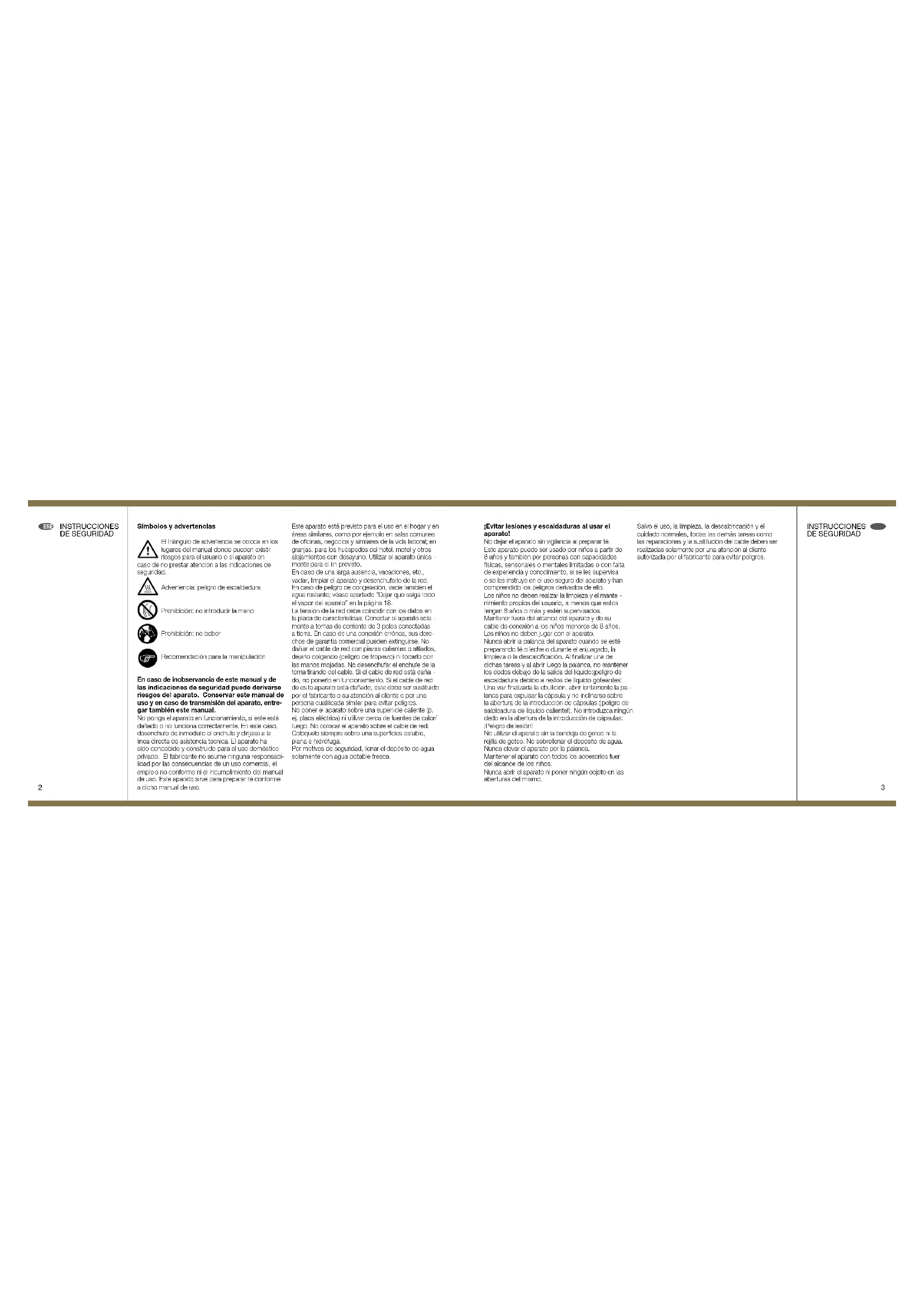 lanca para expulsar la cápsula y no inclinarse sobre la ab ertura de la introducción de cápsulas (¡peligro de salpicadura de líquido caliente!). No introduzca ningún dedo en la abertura de la introducción de cápsulas: ¡Peligro de lesión! No utilizar el aparato sin la bandeja de goteo ni la rejilla de goteo. No sobrellenar el depósito de agua. Nunca elevar el aparato por la palanca. Mantener el aparato con todos los accesorios fuer del alcance de los niños. Nun ca abrir el aparato ni poner ningún objeto en las aberturas del mismo. Salvo el uso, la limpieza, la descalcicación y el cuidado normales, todas las demás tareas como las reparaciones y la sustitución del cable deben ser realizadas solamente por una atención al cliente autorizada por el fabricante para evitar peligros. INSTRUCCIONES DE SEgURIDaD INSTRUCCIONES DE SEgURIDaD ES ES4 5 Antes de la limpieza exterior, sacar el enchufe y dejar enfriar el aparato. No limpiar en húmedo el aparato, el cable de red ni el enchufe y no sumergirlos en líquidos. No limpiar el aparato bajo agua corriente. Nunca ponga el aparato ni sus piezas en el lavavaji