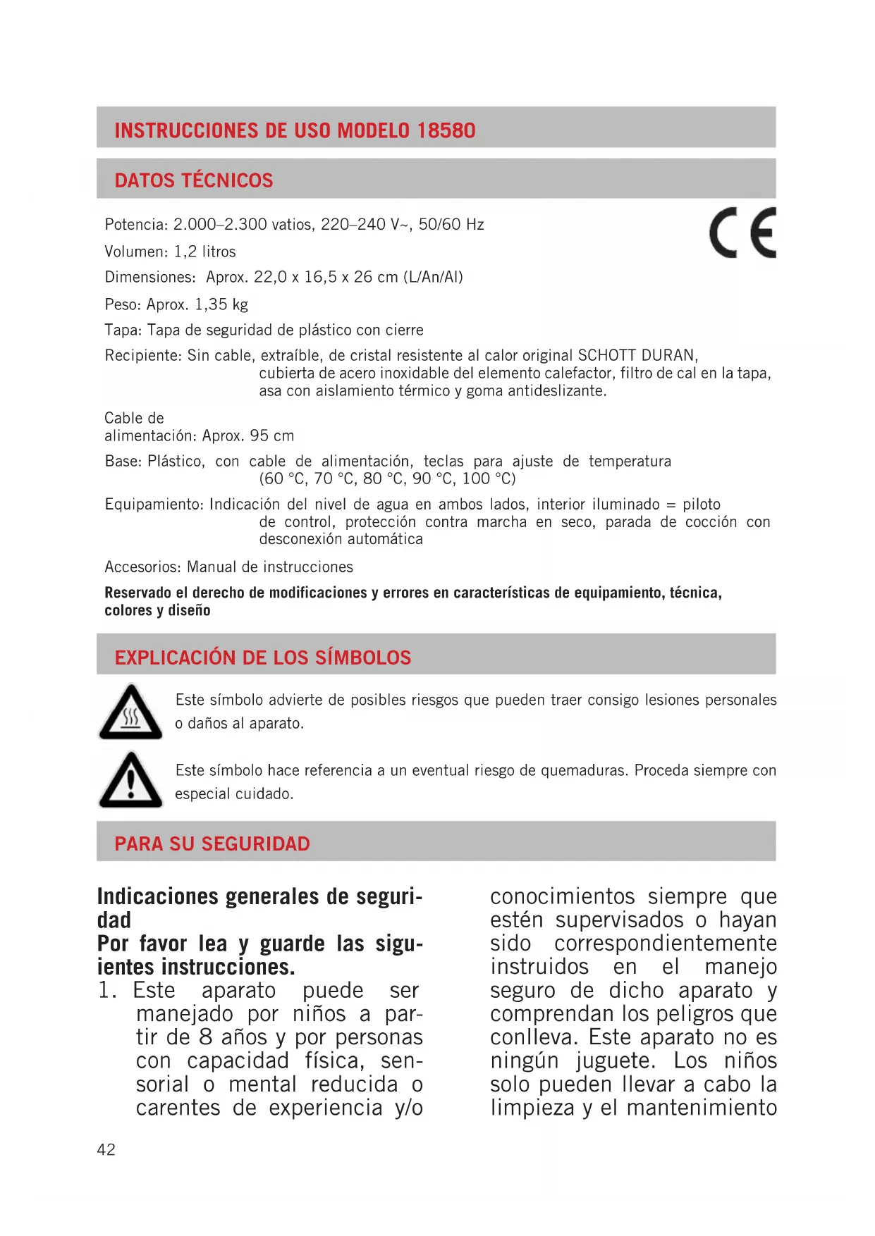 Este símbolo advierte de posibles riesgos que pueden traer consigo lesiones personales o daños al aparato. Este símbolo hace referencia a un eventual riesgo de quemaduras. Proceda siempre con especial cuidado. Potencia: 2.000–2.300 vatios, 220–240 V~, 50/60 Hz Volumen: 1,2 litros Dimensiones: Aprox. 22,0 x 16,5 x 26 cm (L/An/Al) Peso: Aprox. 1,35 kg Tapa: Tapa de seguridad de plástico con cierre Recipiente: Sin cable, extraíble, de cristal resistente al calor original SCHOTT DURAN, cubierta de acero inoxidable del elemento calefactor, filtro de cal en la tapa, asa con aislamiento térmico y goma antideslizante. Cable de alimentación: Aprox. 95 cm Base: Plástico, con cable de alimentación, teclas para ajuste de temperatura (60 °C, 70 °C, 80 °C, 90 °C, 100 °C) Equipamiento: Indicación del nivel de agua en ambos lados, interior iluminado = piloto de control, protección contra marcha en seco, parada de cocción con desconexión automática Accesorios: Manual de instrucciones Reservado el derecho de modificaciones y errores en características de equipamiento, técnica, colores y diseño43 del mismo si están super- visados por un adulto.