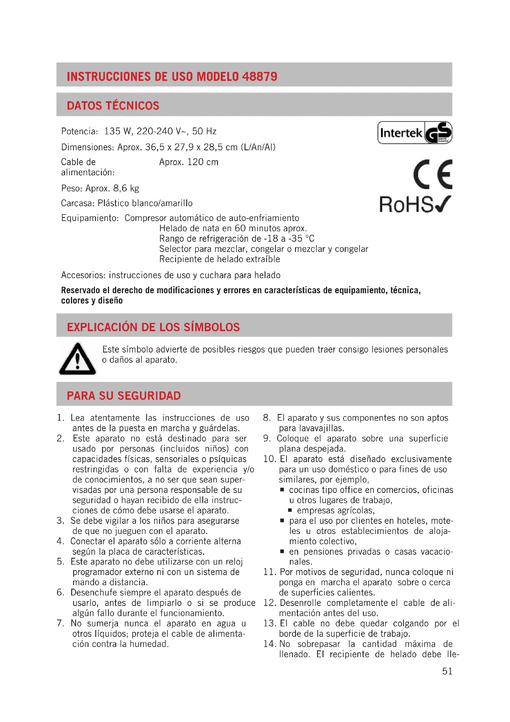 Datos técnicos Potencia: 135 W, 220-240 V~, 50 Hz Dimensiones: Aprox. 36,5 x 27,9 x 28,5 cm (L/An/Al) Cable de alimentación: Aprox. 120 cm Peso: Aprox. 8,6 kg Carcasa: Plástico blanco/amarillo Equipamiento: Compresor automático de auto-enfriamiento Helado de nata en 60 minutos aprox. Rango de refrigeración de -18 a -35 °C Selector para mezclar, congelar o mezclar y congelar Recipiente de helado extraíble Accesorios: instrucciones de uso y cuchara para helado Reservado el derecho de modificaciones y errores en características de equipamiento, técnica, colores y diseño ExPlicación DE los símbolos Este símbolo advierte de posibles riesgos que pueden traer consigo lesiones personales o daños al aparato. Para su sEguriDaD