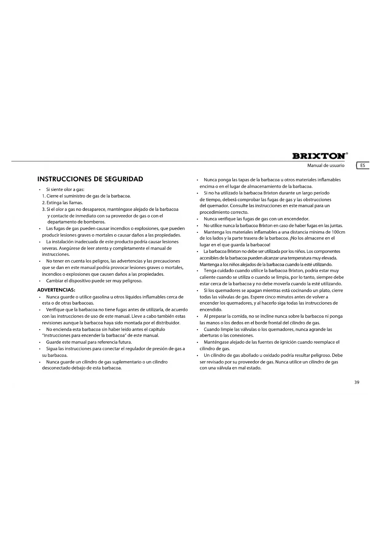 - La bandeja de goteo en la parte delantera estará caliente. Toma esto como una bandeja de goteo hasta que se enfrió NO APTO PARA USO COMERCIAL! INFORMACIÓN DE SEGURIDAD: ADVERTENCIA: La barbacoa está diseñada para ser utilizada con gas, según se indica en la placa. Nunca utilice otros gases en la barbacoa. La no observancia de esta advertencia podría causar un incendio y lesiones corporales. Además se anulará la garantía. ADVERTENCIA: Nunca almacene cilindros de gas de seguridad debajo o cerca de la barbacoa. No llene el cilindro de gas más del 80 por ciento; no cumplir estrictamente esta indicación podría causar un incendio y provocar lesiones mortales o graves. ADVERTENCIA: Mantenga los cables de alimentación y la manguera de combustible lejos de las superficies calientes. ADVERTENCIA: Nunca coloque la barbacoa Brixton bajo una zona resistente al calor o un protector solar. ADVERTENCIA: Esta barbacoa no está destinada para ser instalarla o colocada en una furgoneta o caravana, ni para ser instalada en un barco. ADVERTENCIA: Para su seguridad, nunca almacene o utilice gasolina u otros vapores combustibles o líquidos cerca de esta u otras barbacoas. La no observancia de esta advertencia puede causar incendios, explosiones y lesiones corporales.
