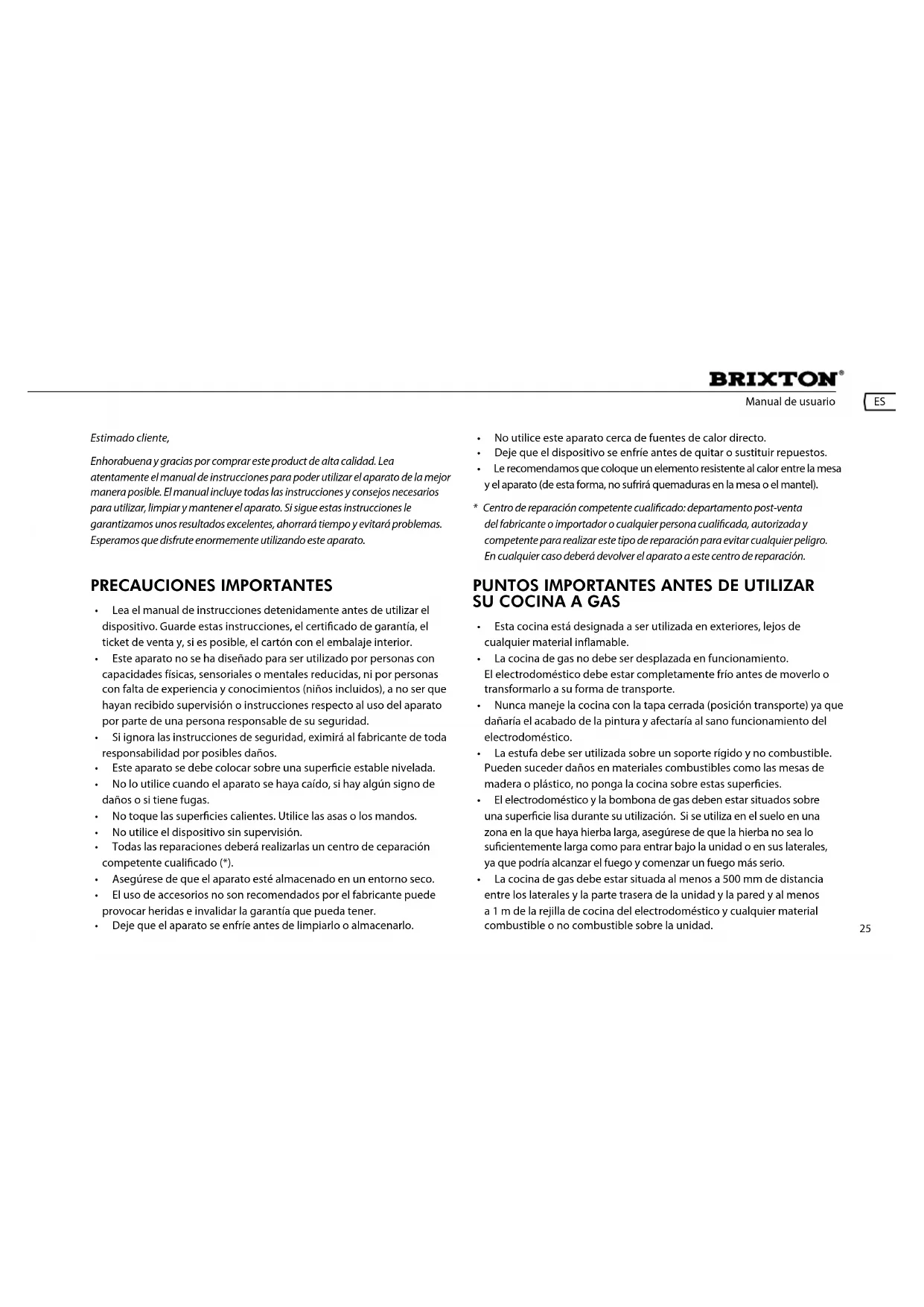 - Centro de reparación competente cualicado: departamento post-venta del fabricante o importador o cualquier persona cualicada, autorizada y competente para realizar este tipo de reparación para evitar cualquier peligro. En cualquier caso deberá devolver el aparato a este centro de reparación. puntos importantes antes de utilizar su cocina a Gas