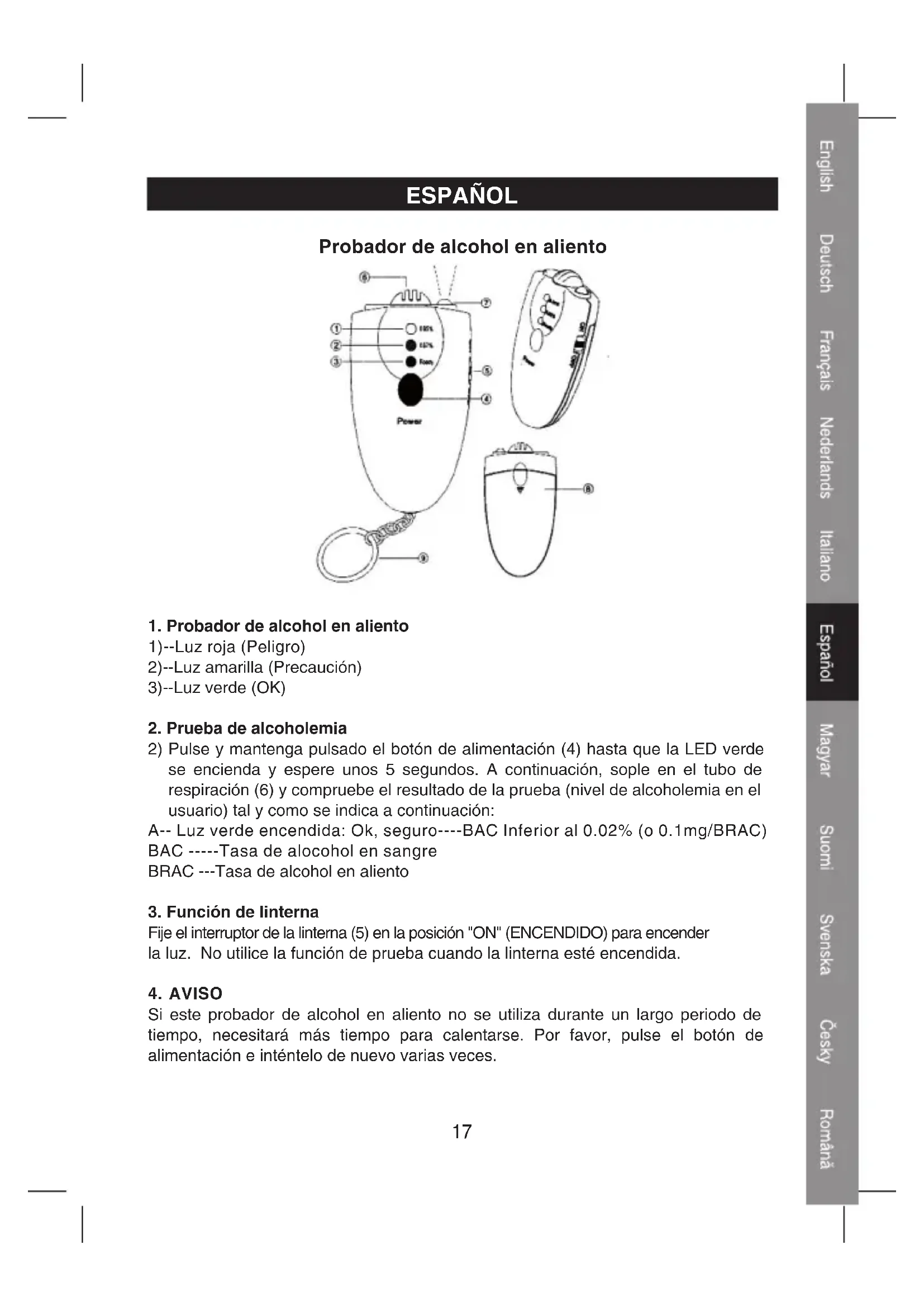 Si este probador de alcohol en aliento no se utiliza durante un largo periodo de tiempo, necesitará más tiempo para calentarse. Por favor, pulse el botón de alimentación e inténtelo de nuevo varias veces. Probador de alcohol en aliento18