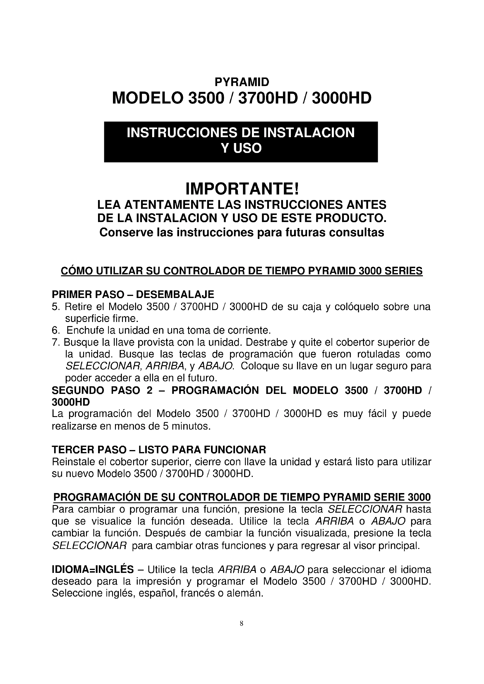 Reinstale el cobertor superior, cierre con llave la unidad y estará listo para utilizar su nuevo Modelo 3500 / 3700HD / 3000HD. PROGRAMACIÓN DE SU CONTROLADOR DE TIEMPO PYRAMID SERIE 3000 Para cambiar o programar una función, presione la tecla SELECCIONAR hasta que se visualice la función deseada. Utilice la tecla ARRIBA o ABAJO para cambiar la función. Después de cambiar la función visualizada, presione la tecla SELECCIONAR para cambiar otras funciones y para regresar al visor principal. IDIOMA=INGLÉS – Utilice la tecla ARRIBA o ABAJO para seleccionar el idioma deseado para la impresión y programar el Modelo 3500 / 3700HD / 3000HD. Seleccione inglés, español, francés o alemán. 8FORMATO DE FECHA=AÑO-MES-DÍA – Utilice la tecla ARRIBA o ABAJO para seleccionar el formato de fecha deseado para la impresión y visualización. Hay tres posibilidades de selección: AA-MM-DD (Año, Mes, Día), MMDDYY (Mes, Día, Año) o DDMMYY (Día, Mes, Año). PROGRAMAR EL AÑO – Utilice la tecla ARRIBA o ABAJO para programar el año deseado. PROGRAMAR EL MES – Utilice la tecla ARRIBA o ABAJO para programar el mes deseado. PROGRAMAR EL DÍA – Utilice la tecla ARRIBA o ABAJO para programar el día deseado. HORARIO DE VERANO= – Permite que los Modelos 3500 / 3700HD / 3000HD se adapten automáticamente para el horario de verano. Hay 5 opciones que puede seleccionar con la tecla ARRIBA o ABAJO: USA07+ Ajusta automáticamente la hora al horario de verano de Estados Unidos 2007 (comenzando el segundo domingo de marzo y culminando el primer domingo de noviembre). USA06- Ajusta automáticamente la hora al horario de verano de Estados Unidos anterior a 2007 (comenzando el primer domingo de abril y culminando el último domingo de octubre). EURO Ajusta automáticamente la hora al horario de verano europeo (comenzando el último domingo de marzo y culminando el último domingo de octubre). OTHER Le permite seleccionar un domingo convencional de comienzo y fin para los cambios automáticos de hora según el horario de verano. Después de SELECCIONAR OTRO, utilice la tecla ARRIBA o ABAJO para seleccionar el domingo (sólo se permite seleccionar domingos) en el que usted desea COMENZAR el horario de verano, presione SELECCIONAR y otra vez utilice la tecla ARRIBA o ABAJO para seleccionar el domingo deseado para FINALIZAR el horario de verano. Observación: La hora cambiará automáticamente a las 2 de la mañana de los domingos seleccionados. DESACTIVADO- La unidad no adaptará la hora al horario de verano. EST TEMP=LÍNEA. Esta opción sólo se debe cambiar para las zonas externas a Estados Unidos donde hay variación de frecuencia de la energía eléctrica. Si usted opera esta unidad en una zona que tiene problemas con la frecuencia de energía eléctrica que puede provocar un retraso o adelanto de tiempo o si usted administra la unidad desde un generador/inversor, utilice la tecla ARRIBA o ABAJO para cambiar el EST TEMP a CRISTAL que permitirá que la unidad mantenga el registro del tiempo utilizando un dispositivo interno. 9FORMATO DEL VISOR=AM/PM – Seleccione la forma en que se mostrará la hora en el frente de la unidad. Utilizando las teclas ARRIBA o ABAJO, seleccione una de las siguientes opciones: