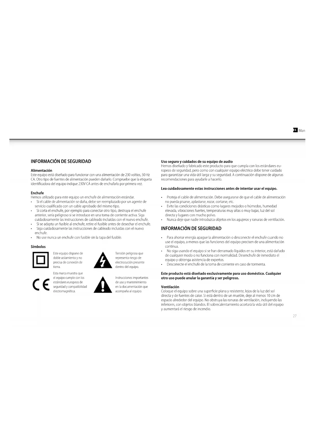 - No use nunca un enchufe con fusible sin la tapa del fusible. Símbolos Este equipo dispone de doble aislamiento y no precisa de conexión de tierra. Tensión peligrosa que representa riesgo de electrocución presente dentro del equipo. Esta marca muestra que el equipo cumple con los estándares europeos de seguridad y compatibilidad electromagnética. Instrucciones importantes de uso y mantenimiento en la documentación que acompaña al equipo. Uso seguro y cuidados de su equipo de audio Hemos diseñado y fabricado este producto para que cumpla con los estándares eu- ropeos de seguridad, pero como con cualquier equipo eléctrico debe tener cuidado para garantizar una vida útil larga y su seguridad. A continuación dispone de algunas recomendaciones para ayudarle a hacerlo. Lea cuidadosamente estas instrucciones antes de intentar usar el equipo.