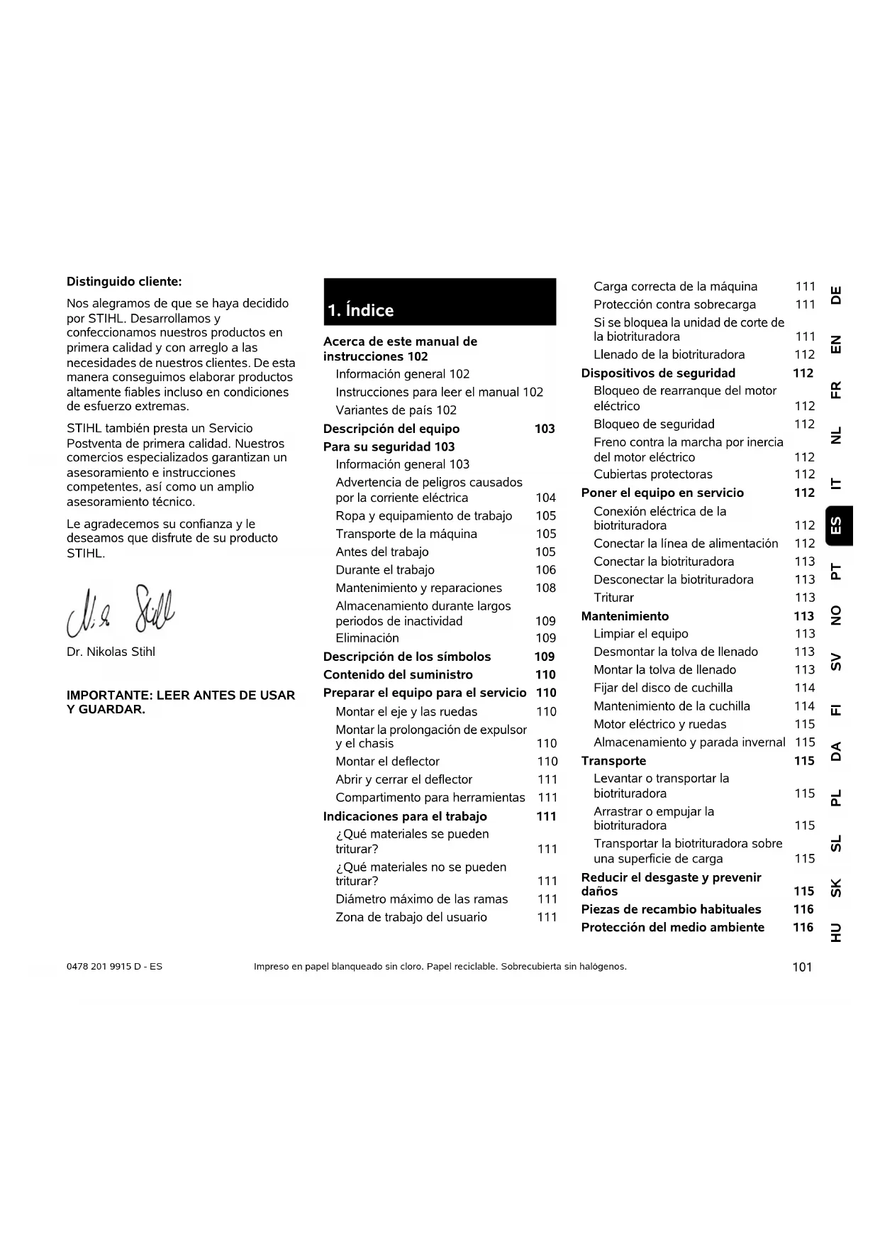 DEENFRNLITPTNOSVFIDAPLSLSKHU ES 0478 201 9915 D - ES Distinguido cliente: Nos alegramos de que se haya decidido por STIHL. Desarrollamos y confeccionamos nuestros productos en primera calidad y con arreglo a las necesidades de nuestros clientes. De esta manera conseguimos elaborar productos altamente fiables incluso en condiciones de esfuerzo extremas. STIHL también presta un Servicio Postventa de primera calidad. Nuestros comercios especializados garantizan un asesoramiento e instrucciones competentes, así como un amplio asesoramiento técnico. Le agradecemos su confianza y le deseamos que disfrute de su producto STIHL. Dr. Nikolas Stihl