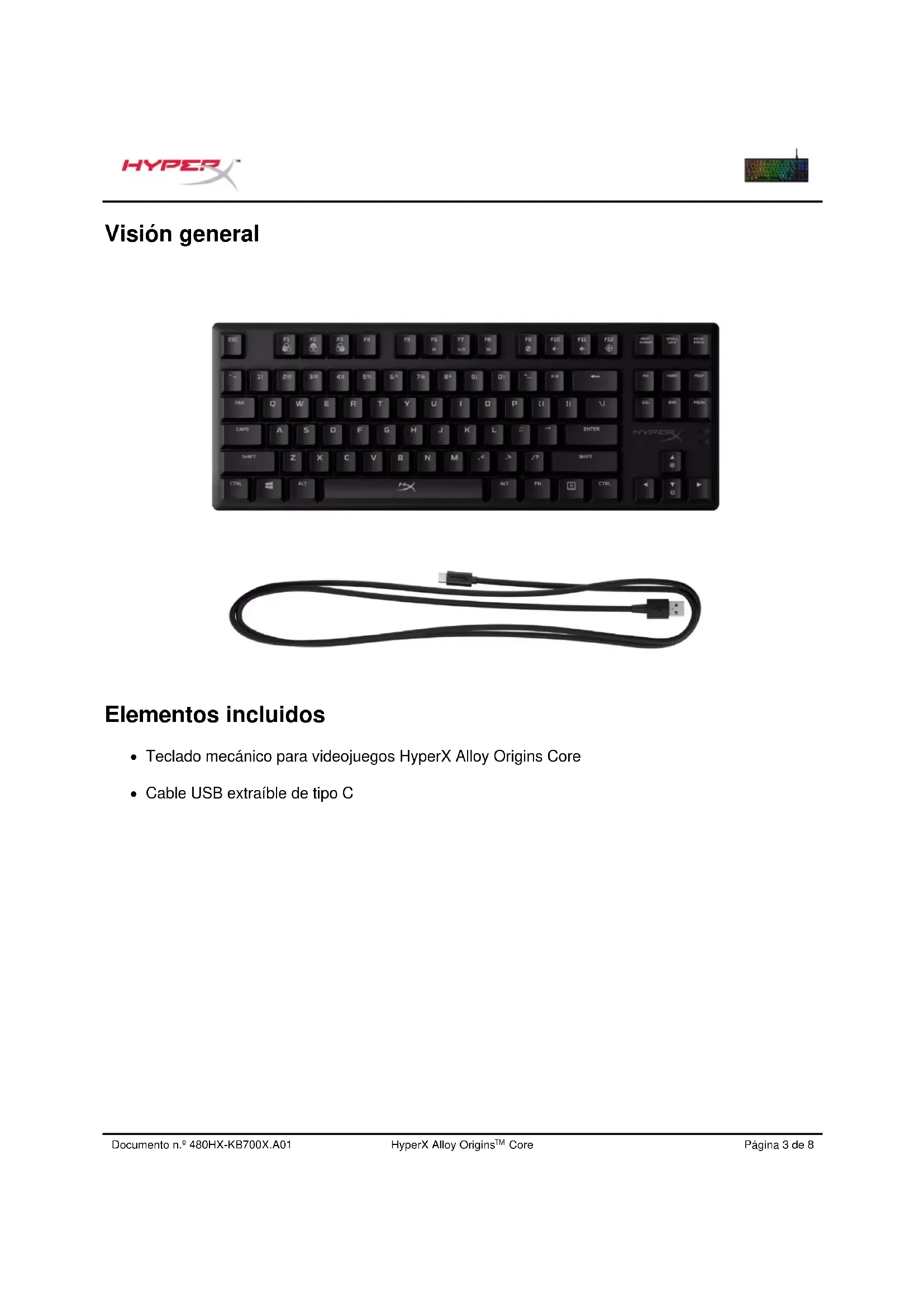 ¿Alguna pregunta o problema de configuración? Ponte en contacto con el equipo de soporte de HyperX en: hyperxgaming.com/support/Document No. 480HX-KB700X.A01 HyperX Alloy Origins Core Seite 1 von 8