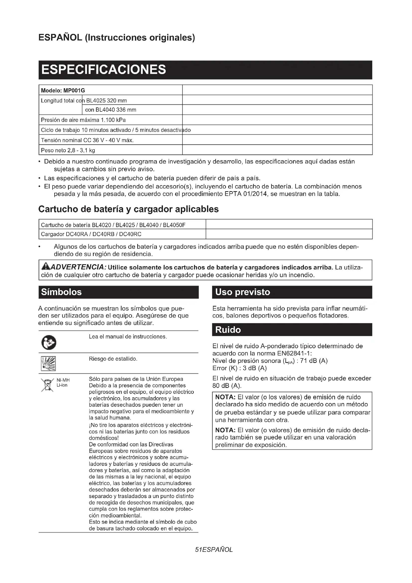 ESPAÑOL (Instrucciones originales) ESPECIFICACIONES Modelo: MP001G Longitud total con BL4025 320 mm con BL4040 336 mm Presión de aire máxima 1.100 kPa Ciclo de trabajo 10 minutos activado / 5 minutos desactivado Tensión nominal CC 36 V - 40 V máx. Peso neto 2,8 - 3,1 kg