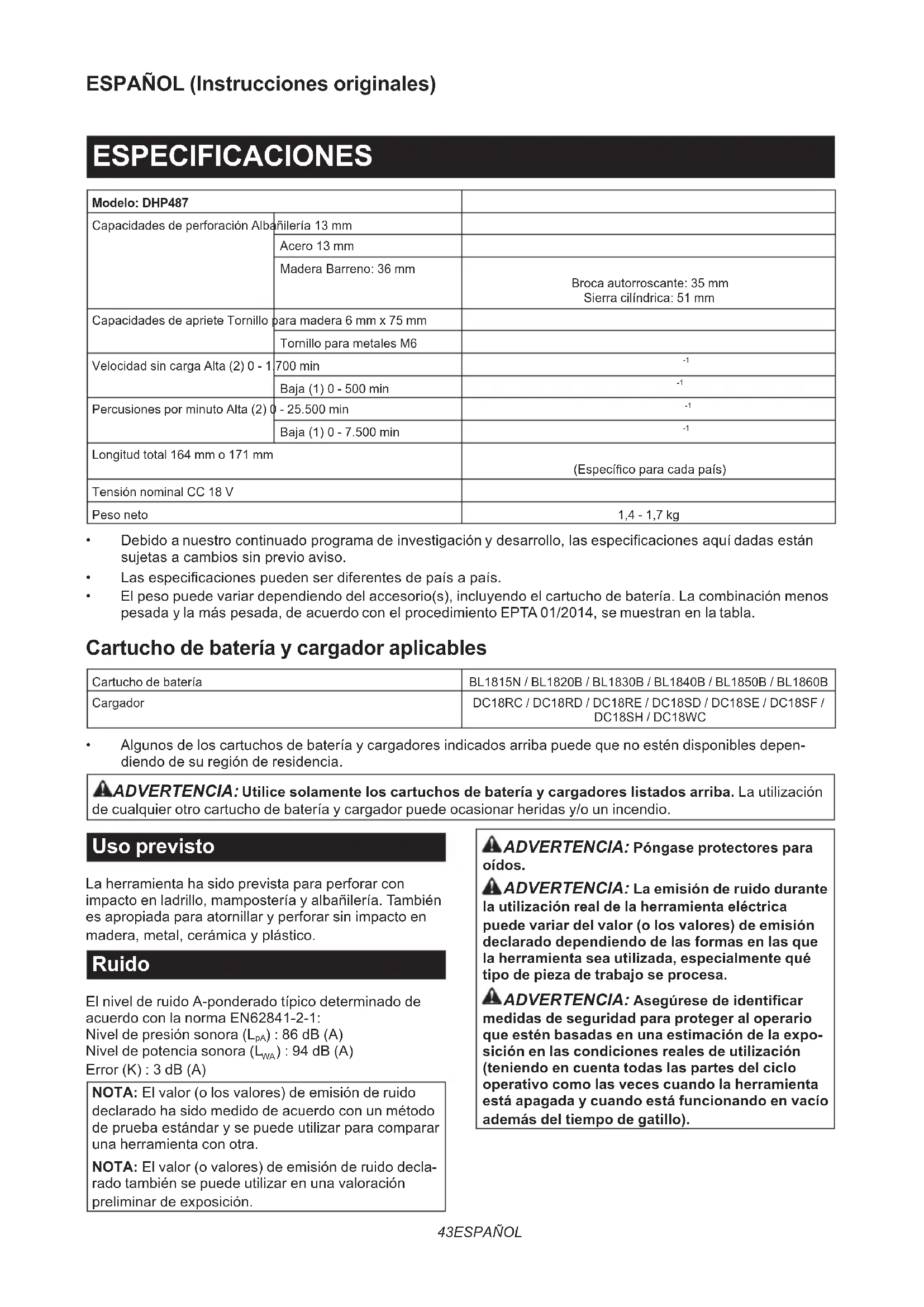 - Algunos de los cartuchos de batería y cargadores indicados arriba puede que no estén disponibles depen- diendo de su región de residencia. ADVERTENCIA: Utilice solamente los cartuchos de batería y cargadores listados arriba. La utilización de cualquier otro cartucho de batería y cargador puede ocasionar heridas y/o un incendio. Uso previsto La herramienta ha sido prevista para perforar con impacto en ladrillo, mampostería y albañilería. También es apropiada para atornillar y perforar sin impacto en madera, metal, cerámica y plástico. Ruido El nivel de ruido A-ponderado típico determinado de acuerdo con la norma EN62841-2-1: Nivel de presión sonora (L