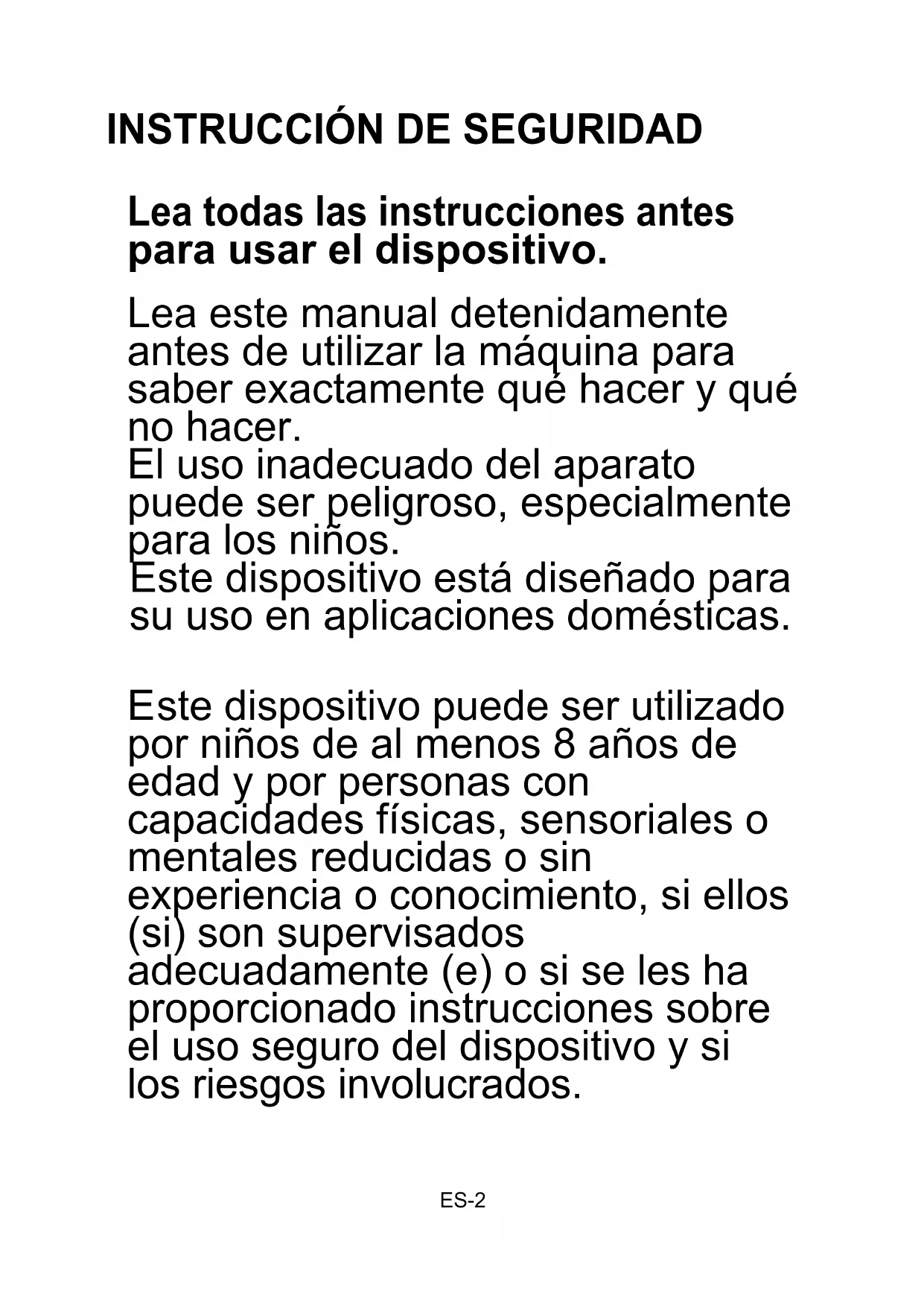 Lea todas las instrucciones antes para usar el dispositivo. Lea este manual detenidamente antes de utilizar la máquina para saber exactamente qué hacer y qué no hacer. El uso inadecuado del aparato puede ser peligroso, especialmente para los niños. Este dispositivo está diseñado para su uso en aplicaciones domésticas.