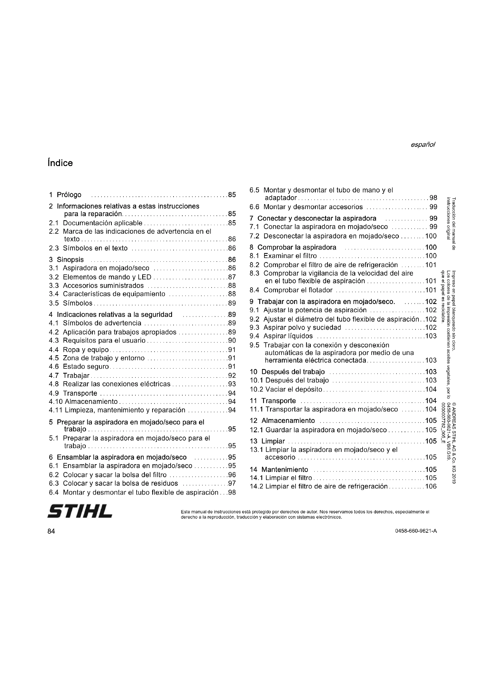 ADVERTENCIA ■ En determinadas situaciones, el usuario no puede trabajar con concentración. El usuario puede tropezar, caerse o sufrir lesiones graves. ► Trabajar con tranquilidad y precaución. ► Si las condiciones de luz y de visibilidad son deficientes: no trabajar con la aspiradora en mojado/seco. ► Manejar solo un operario la aspiradora en mojado/seco. ► Prestar atención a los obstáculos. ► Trabajar estando de pie en el suelo y mantener el equilibrio. ► Si presentan signos de fatiga: hacer una pausa de trabajo. ■ Si la aspiradora en mojado/seco cambia durante el trabajo o se comporta de forma no habitual, puede que dicha aspiradora no esté en un estado seguro. Las personas pueden sufrir lesiones graves y se pueden producir daños materiales. ► Finalizar el trabajo, desenchufar el enchufe de la red y acudir a un distribuidor especializado STIHL. ► Trabajar con la aspiradora en mojado/seco solo estando esta en posición vertical. ► No cubrir la aspiradora en mojado/seco para proporcionar un intercambio suficiente de aire de refrigeración. ■ Si se aspiran líquidos, puede producirse espuma. La espuma no puede activar el flotador y puede ser aspirado hacia el motor. La aspiradora en mojado/seco puede dañarse. ► Si sale espuma: finalizar el trabajo, desenchufar el enchufe de la red y acudir a un distribuidor especializado STIHL.0458-660-9621-A