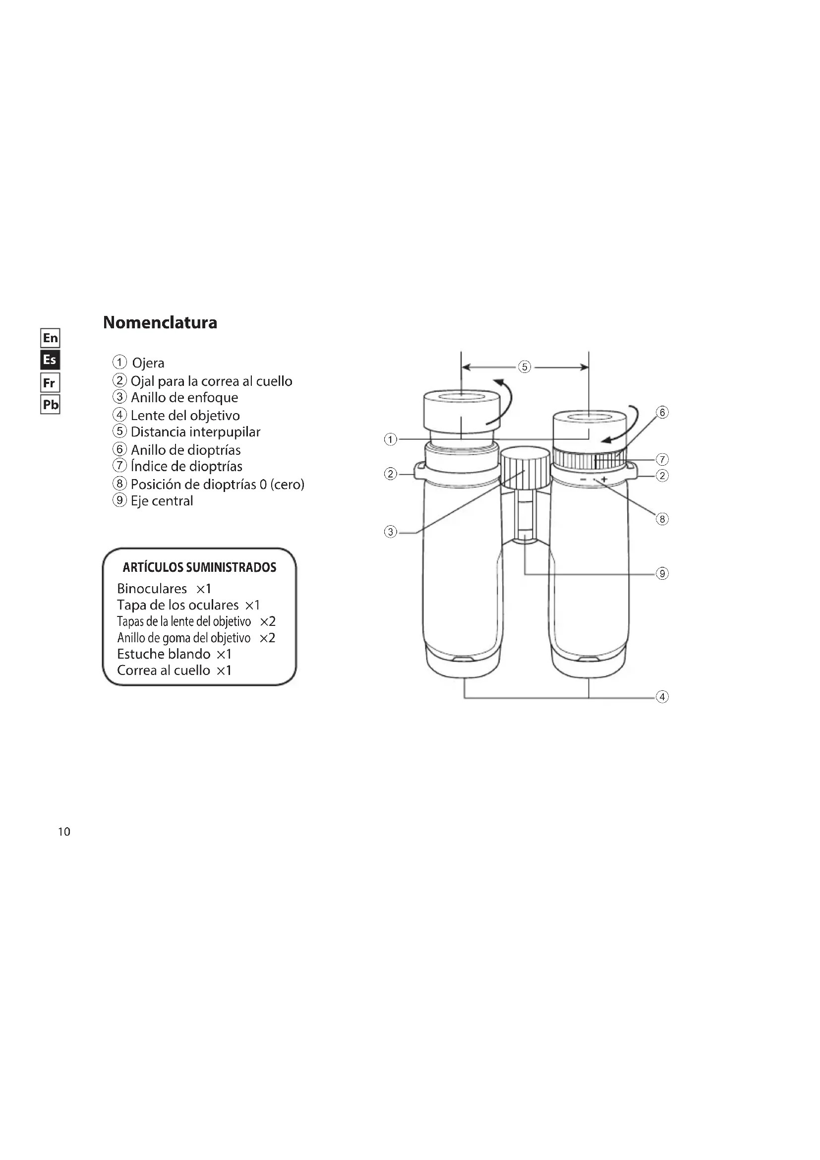 Nomenclatura 1 Ojera 2 Ojal para la correa al cuello 3 Anillo de enfoque 4 Lente del objetivo 5 Distancia interpupilar 6 Anillo de dioptrías 7 Índice de dioptrías 8 Posición de dioptrías 0 (cero) 9 Eje central