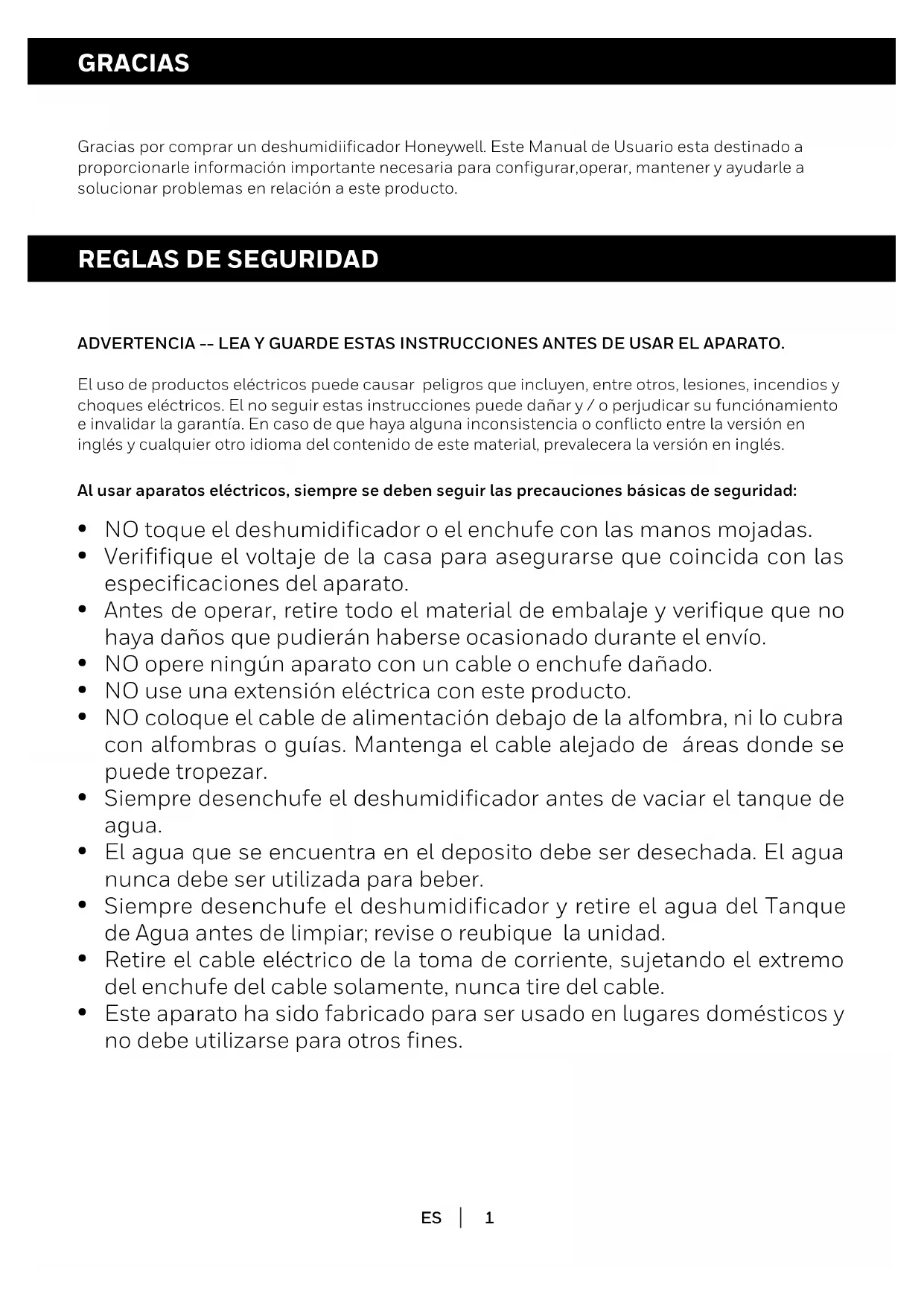 Gracias por comprar un deshumidiificador Honeywell. Este Manual de Usuario esta destinado a proporcionarle información importante necesaria para configurar,operar, mantener y ayudarle a solucionar problemas en relación a este producto. ADVERTENCIA -- LEA Y GUARDE ESTAS INSTRUCCIONES ANTES DE USAR EL APARATO. El uso de productos eléctricos puede causar peligros que incluyen, entre otros, lesiones, incendios y choques eléctricos. El no seguir estas instrucciones puede dañar y / o perjudicar su funciónamiento e invalidar la garantía. En caso de que haya alguna inconsistencia o conflicto entre la versión en inglés y cualquier otro idioma del contenido de este material, prevalecera la versión en inglés. Al usar aparatos eléctricos, siempre se deben seguir las precauciones básicas de seguridad:
