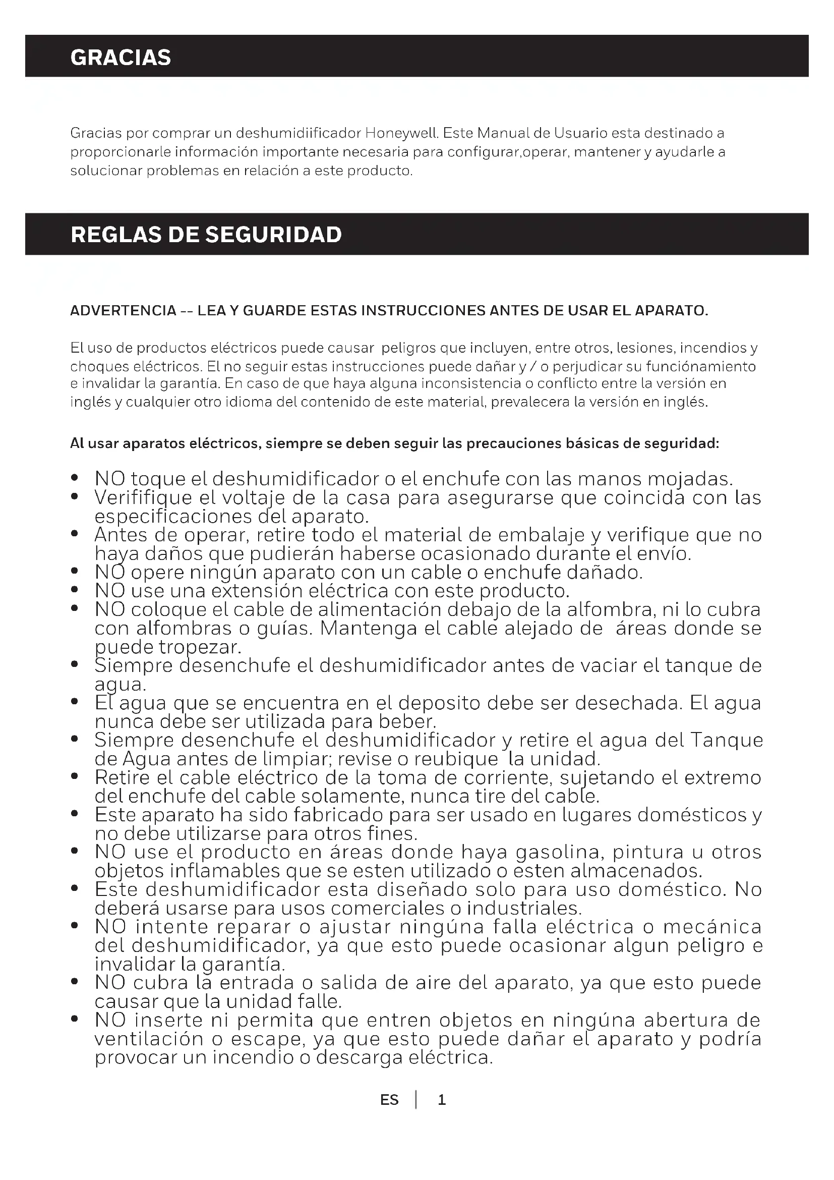 Gracias por comprar un deshumidiificador Honeywell. Este Manual de Usuario esta destinado a proporcionarle información importante necesaria para configurar,operar, mantener y ayudarle a solucionar problemas en relación a este producto. ADVERTENCIA -- LEA Y GUARDE ESTAS INSTRUCCIONES ANTES DE USAR EL APARATO. El uso de productos eléctricos puede causar peligros que incluyen, entre otros, lesiones, incendios y choques eléctricos. El no seguir estas instrucciones puede dañar y / o perjudicar su funciónamiento e invalidar la garantía. En caso de que haya alguna inconsistencia o conflicto entre la versión en inglés y cualquier otro idioma del contenido de este material, prevalecera la versión en inglés. Al usar aparatos eléctricos, siempre se deben seguir las precauciones básicas de seguridad: