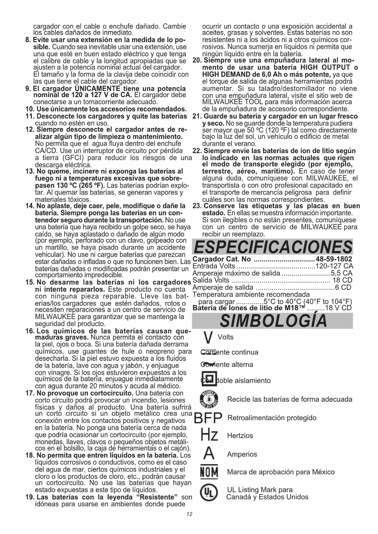 - estado. En ellas se muestra información importante. Si son ilegibles o no están presentes, comuníquese con un centro de servicio de MILWAUKEE para recibir un reemplazo. ESPECIFICACIONES Cargador Cat. No p. 48