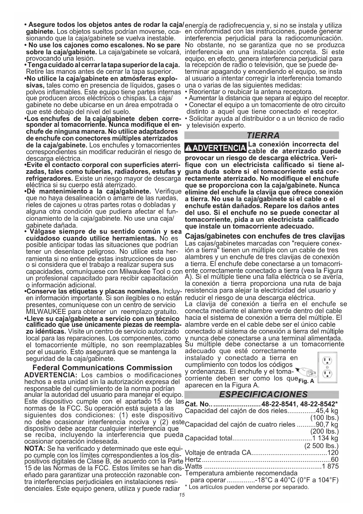 - Solicitar ayuda al distribuidor o a un técnico de radio y televisión experto. TIERRA ADVERTENCIA La conexión incorrecta del cable de aterrizado puede provocar un riesgo de descarga eléctrica. Veri- que con un electricista calicado si tiene al- guna duda sobre si el tomacorriente está cor- rectamente aterrizado. No modique el enchufe que se proporciona con la caja/gabinete. Nunca elimine del enchufe la clavija que ofrece conexión a tierra. No use la caja/gabinete si el cable o el enchufe están dañados. Repare los daños antes del uso. Si el enchufe no se puede conectar al tomacorriente, pida a un electricista calicado que instale un tomacorriente adecuado. Cajas/gabinetes con enchufes de tres clavijas Las cajas/gabinetes marcadas con "requiere conex- ión a tierra" tienen un múltiple con un cable de tres alambres y un enchufe de tres clavijas de conexión a tierra. El enchufe debe conectarse a un tomacorri- ente correctamente conectado a tierra (vea la Figura A). Si el múltiple tiene una falla eléctrica o se avería, la conexión a tierra proporciona una ruta de baja resistencia para alejar la electricidad del usuario y reducir el riesgo de una descarga eléctrica. La clavija de conexión a tierra en el enchufe se conecta mediante el alambre verde dentro del cable hacia el sistema de conexión a tierra del múltiple. El alambre verde en el cable debe ser el único cable conectado al sistema de conexión a tierra del múltiple y nunca debe conectarse a una terminal alimentada. Su múltiple debe conectarse a un tomacorriente adecuado que esté correctamente Fig. A instalado y conectado a tierra en cumplimiento con todos los códigos y ordenanzas. El enchufe y el toma- corriente deben ser como los que aparecen en la Figura A. ESPECIFICACIONES Cat. No.. ......................... 48-22-8541, 48-22-8542* Capacidad del cajón de dos rieles...............45,4 kg (100 lbs.) Capacidad del cajón de cuatro rieles ..........90,7 kg (200 lbs.) Capacidad total..........................................1 134 kg (2 500 lbs.) Voltaje de entrada CA ........................................120 Hertz ....................................................................60 Watts ..............................................................1 875 Temperatura ambiente recomendada para operar ...............-18°C a 40°C (0°F a 104°F)