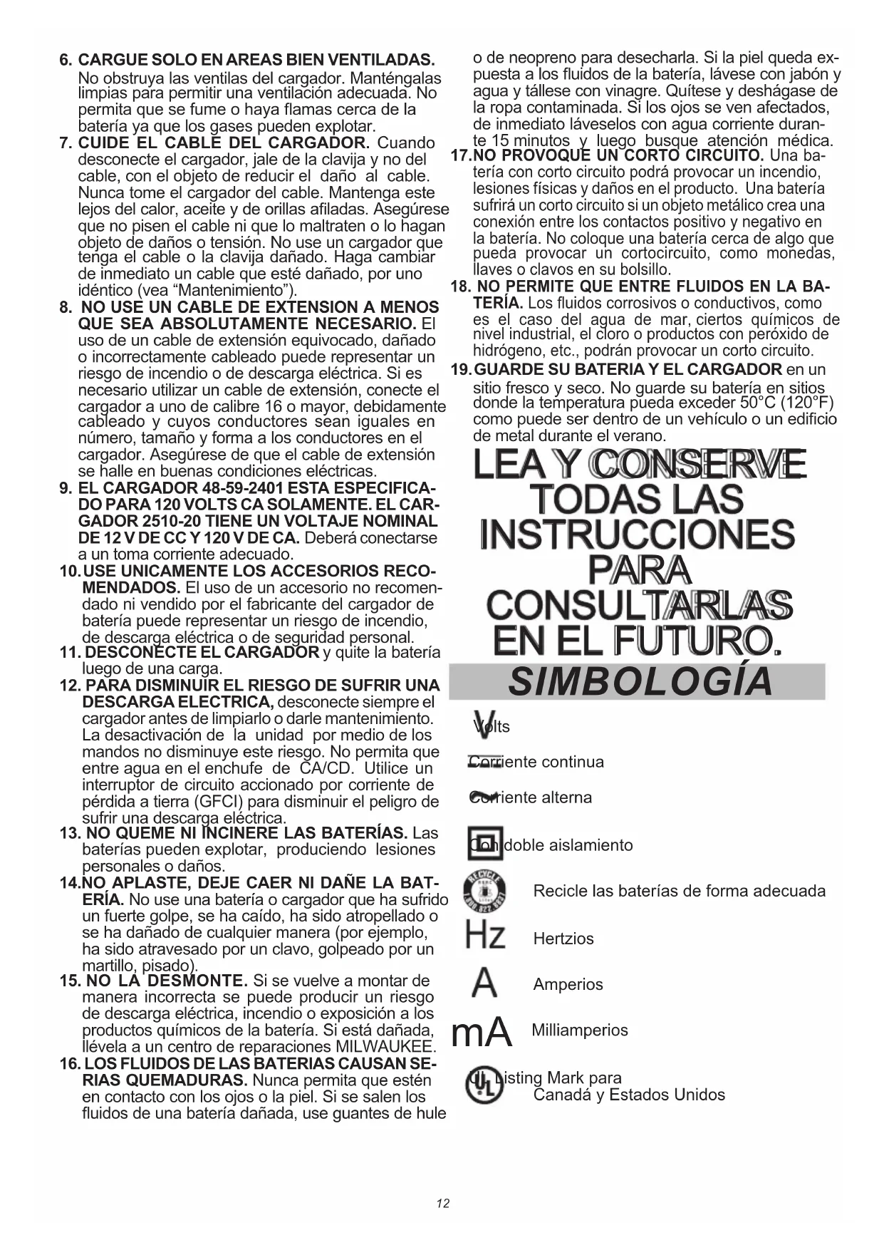 TODAS LAS INSTRUCCIONES PARA CONSULTARLAS EN EL FUTURO. SIMBOLOGÍA Volts Corriente continua Corriente alterna Con doble aislamiento Recicle las baterías de forma adecuada Hertzios Amperios