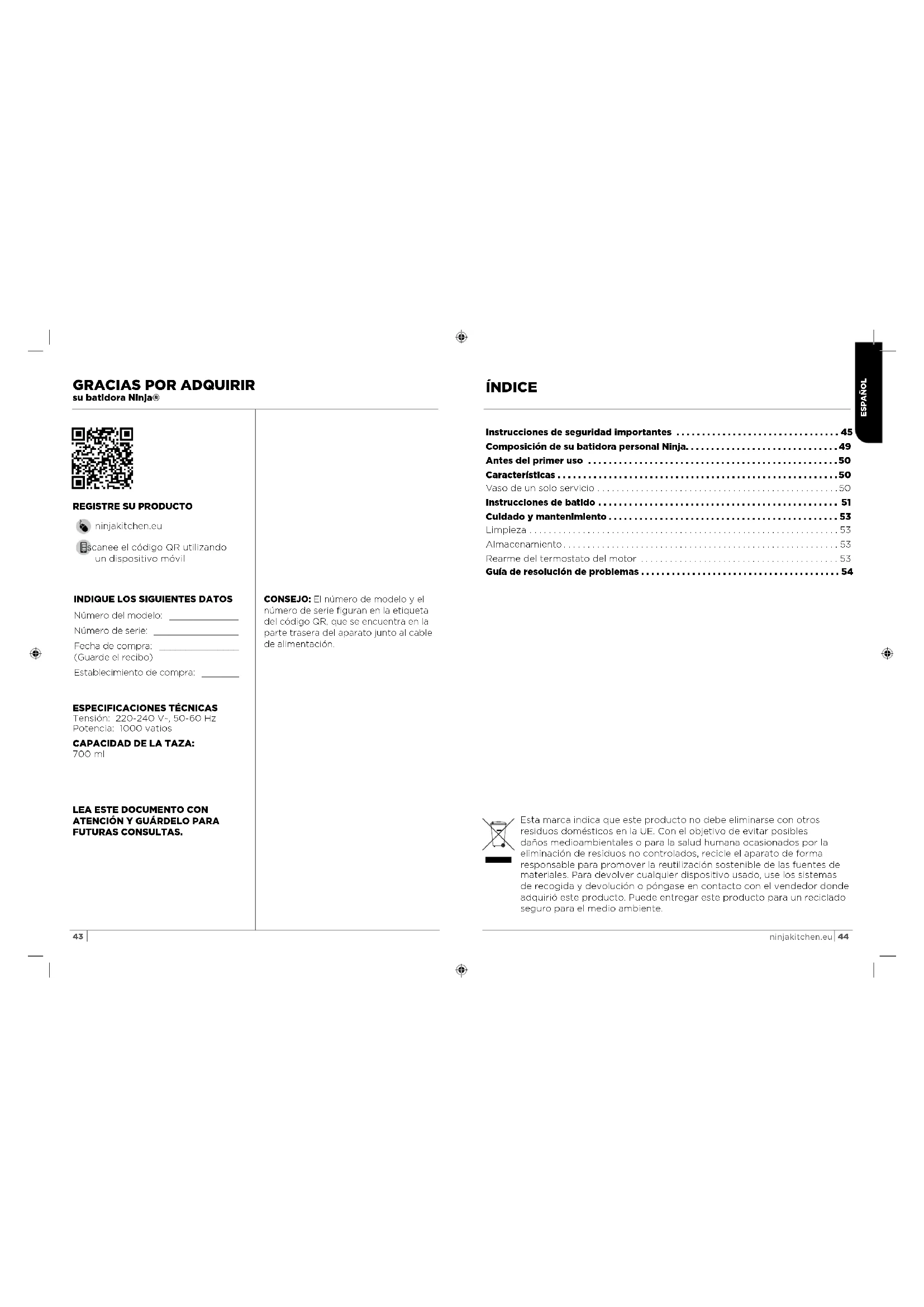 su batidora Ninja® Esta marca indica que este producto no debe eliminarse con otros residuos domésticos en la UE. Con el objetivo de evitar posibles daños medioambientales opara la salud humana ocasionados por la eliminación de residuos no controlados, recicle el aparato de forma responsable para promover la reutilización sostenible de las fuentes de materiales. Para devolver cualquier dispositivo usado, use los sistemas de recogida y devolución o póngase en contacto con el vendedor donde adquirió este producto. Puede entregar este producto para un reciclado seguro para el medio ambiente. ESPAÑOL45 46 ninjakitchen.eu Lea todas las instrucciones antes de usar su NINJA
