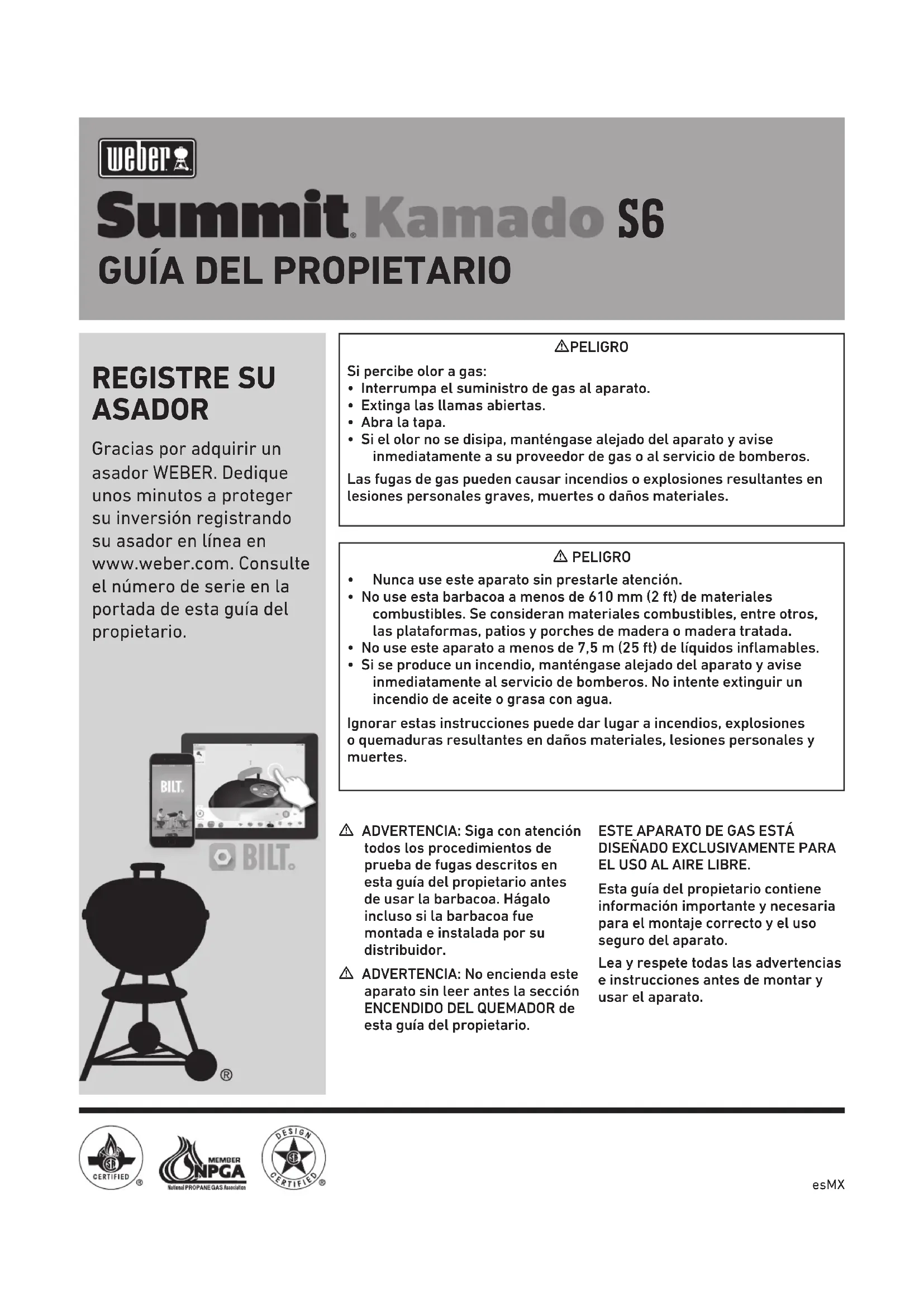EL USO AL AIRE LIBRE. Esta guía del propietario contiene información importante y necesaria para el montaje correcto y el uso seguro del aparato. Lea y respete todas las advertencias e instrucciones antes de montar y usar el aparato. REGISTRE SU ASADOR Gracias por adquirir un asador WEBER. Dedique unos minutos a proteger su inversión registrando su asador en línea en www.weber.com. Consulte el número de serie en la portada de esta guía del propietario. S634 SEGURIDAD El incumplimiento de las instrucciones relativas a los PELIGROS, ADVERTENCIAS y PRECAUCIONES contenidas en la presente guía del propietario podría causar lesiones graves o muertes, u originar un incendio o explosión que resultara en daños materiales. PELIGRO: Indica una situación peligrosa que, de no evitarse, provocará muertes o lesiones graves. m El uso de este asador solo debe tener lugar al aire libre, en áreas bien ventiladas. Se prohíbe el uso en garajes, edificios, pasajes cubiertos, tiendas de campaña y otras áreas cerradas, así como debajo de techos combustibles. m Este asador no ha sido diseñado para usarse como calentador y no debe emplearse jamás como tal. m Mantenga el área destinada a la preparación de alimentos libre de vapores y líquidos inflamables, como gasolina, alcohol, etc., así como de materiales combustibles. m Abra siempre la tapa antes de encender el quemador de gas manualmente o mediante el sistema de encendido. La tapa debe permanecer abierta hasta que el carbón esté totalmente encendido. m Si la grasa liberada por los alimentos provocase un incendio, apague el quemador y mantenga la tapa cerrada hasta que las llamas se extingan. m Este asador no debe ser usado jamás por niños. Algunas piezas del asador al alcance del usuario pueden estar muy calientes. Los niños y mascotas deben mantenerse alejados durante el uso del asador. m No intente desconectar el cilindro de gas con el asador en funcionamiento. m En caso de que el quemador se apague con el asador en funcionamiento, cierre la válvula de gas. Abra la tapa y espere 5minutos antes de intentar volver a encender el asador. m No use el asador si presenta una fuga de gas. m No use una llama para revisar la existencia de fugas de gas. m No coloque la funda del asador ni ningún otro objeto inflamable dentro o encima del espacio de almacenamiento localizado debajo del mismo durante el uso del asador o mientras este se encuentre caliente. m Si observa, huele o escucha un escape de gas procedente del cilindro de propano líquido: