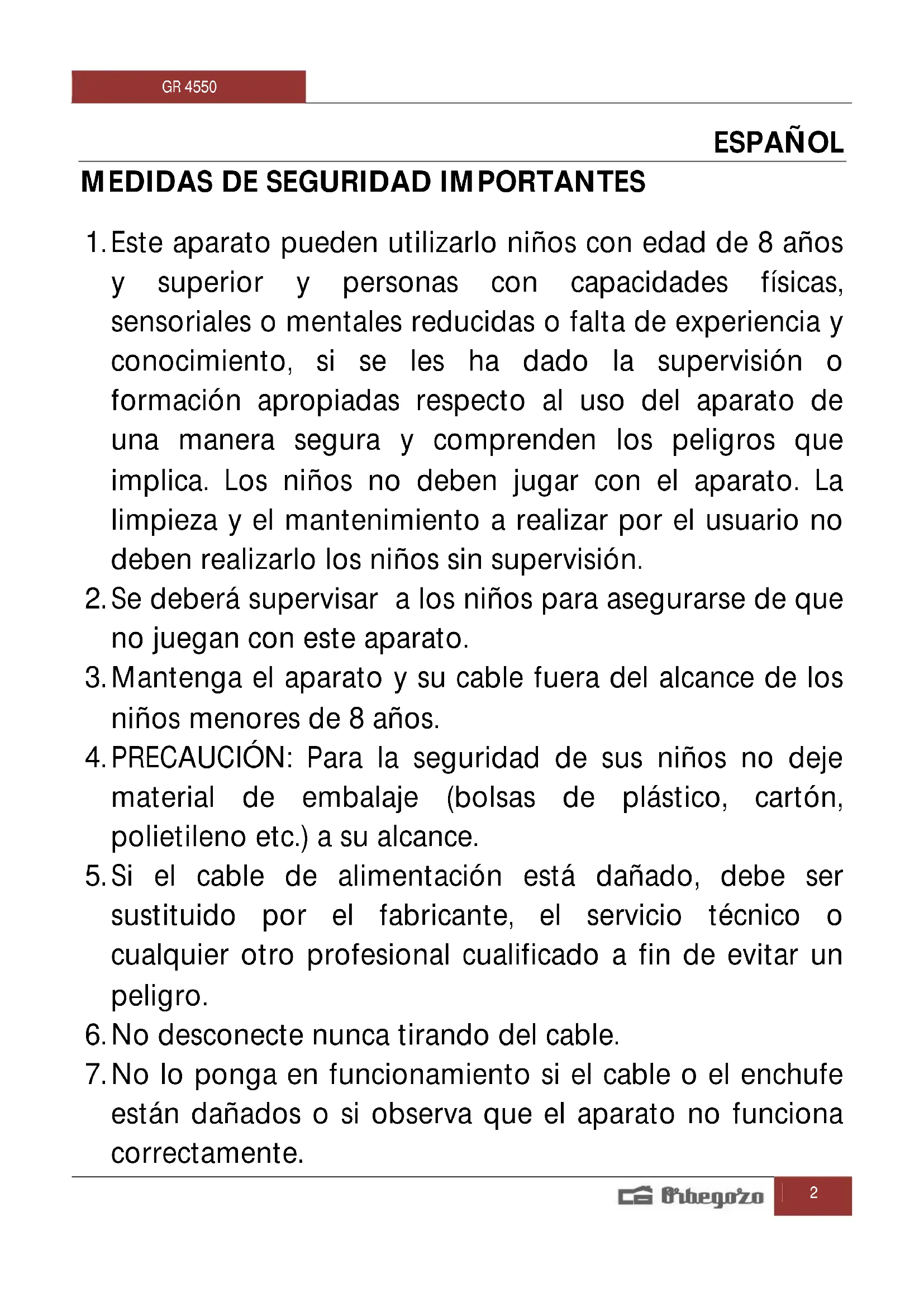 MANUAL DE USUARIO GR 4550 Orbegozo