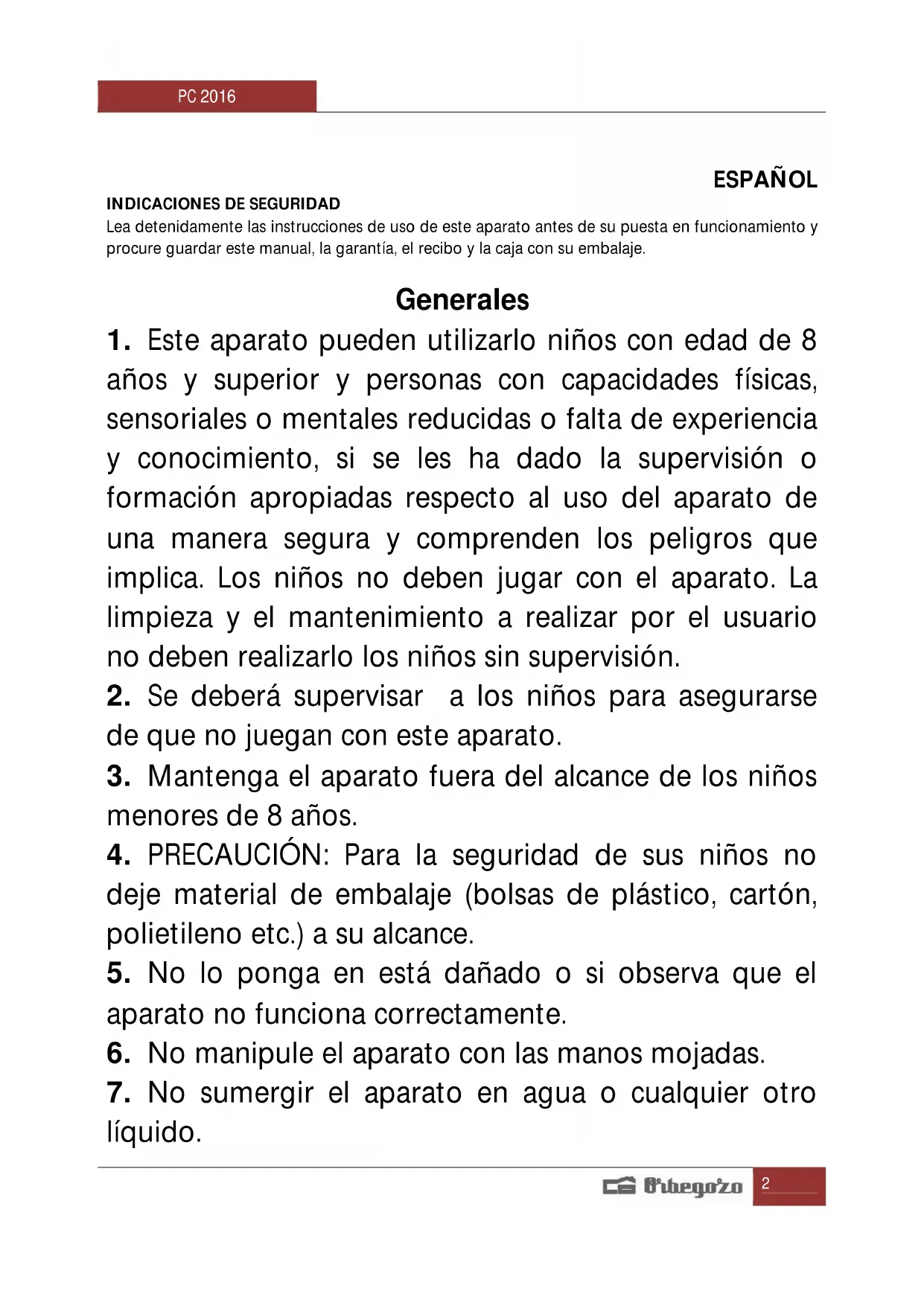 Encuentra gratis el manual del aparato PC 2016 Orbegozo en formato PDF.