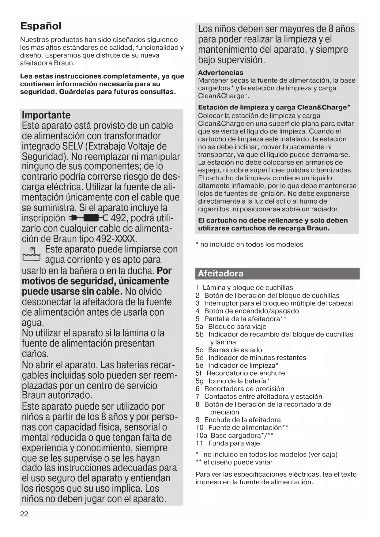 démarrage. Augmentation de la consommation de liquide de nettoyage. L’orifice de la station Clean& Charge est bouché. – Nettoyez l’orifice avec un cure-dent en bois. – Nettoyez régulièrement le bac de nettoyage. Garantie Nous accordons une garantie de 2 ans sur ce produit, à partir de la date d’achat. Pendant la durée de la garantie, Braun prendra gratuitement à sa charge la réparation des vices de fabrication ou de matière en se réservant le droit de décider si certaines pièces doivent être réparées ou si l’appareil lui-même doit être échangé. Cette garantie s’étend à tous les pays où cet appareil est commercialisé par Braun ou son distributeur exclusif. Cette garantie ne couvre pas : les dommages occasionnés par une utilisation inadéquate, l’usure normale (par exemple, grille et bloc-couteaux) ainsi que les défauts d’usures qui ont un effet négligeable sur la valeur ou l’utilisation de l’appareil. Cette garantie devient caduque si des réparations ont été effectuées par des personnes non agréées par Braun et si des pièces de rechange ne provenant pas de Braun ont été utilisées. Pour toute réclamation intervenant pendant la période de garantie, retournez ou rapportez l’appareil ainsi que l’attestation de garantie à votre revendeur ou à un Centre Service Agréé Braun. Veuillez vous référer à www.service.braun.com ou appeler le 0 800 944 802 (service consommateurs – service & appel gratuits) pour connaître le Centre Service Agrée Braun le plus proche de chez vous. Clause spéciale pour la France Outre la garantie contractuelle exposée ci-dessus, nos clients bénéficient de la garantie légale des vices caches prévue aux articles 1641 et suivants du Code civil. 91818830_83XXcc_W&D_MN_Type_5795.indd 2191818830_83XXcc_W&D_MN_Type_5795.indd 21 09.05.18 09:1509.05.18 09:15 Business Use - P&G AUTHORIZED POA-00044767 Rev 001 Effective Date 2018-05-14 Printed 2018-07-25 Page 21 of 7222 Español Nuestros productos han sido diseñados siguiendo los más altos estándares de calidad, funcionalidad y diseño. Esperamos que disfrute de su nueva afeitadora Braun. Lea estas instrucciones completamente, ya que contienen información necesaria para su seguridad. Guárdelas para futuras consultas. Importante Este aparato está provisto de un cable de alimentación con transformador integrado SELV (Extrabajo Voltaje de Seguridad). No reemplazar ni manipular ninguno de sus componentes; de lo contrario podría correrse riesgo de des- carga eléctrica. Utilizar la fuente de ali- mentación únicamente con el cable que se suministra. Si el aparato incluye la inscripción 492, podrá utili- zarlo con cualquier cable de alimenta- ción de Braun tipo 492-XXXX. Este aparato puede limpiarse con agua corriente y es apto para usarlo en la bañera o en la ducha. Por motivos de seguridad, únicamente puede usarse sin cable. No olvide desconectar la afeitadora de la fuente de alimentación antes de usarla con agua. No utilizar el aparato si la lámina o la fuente de alimentación presentan daños. No abrir el aparato. Las baterías recar- gables incluidas solo pueden ser reem- plazadas por un centro de servicio Braun autorizado. Este aparato puede ser utilizado por niños a partir de los 8 años y por perso- nas con capacidad física, sensorial o mental reducida o que tengan falta de experiencia y conocimiento, siempre que se les supervise o se les hayan dado las instrucciones adecuadas para el uso seguro del aparato y entiendan los riesgos que su uso implica. Los niños no deben jugar con el aparato. Los niños deben ser mayores de 8 años para poder realizar la limpieza y el mantenimiento del aparato, y siempre bajo supervisión. Advertencias Mantener secas la fuente de alimentación, la base cargadora* y la estación de limpieza y carga Clean&Charge*. Estación de limpieza y carga Clean&Charge* Colocar la estación de limpieza y carga Clean&Charge en una superficie plana para evitar que se vierta el líquido de limpieza. Cuando el cartucho de limpieza esté instalado, la estación no se debe inclinar, mover bruscamente ni transportar, ya que el líquido puede derramarse. La estación no debe colocarse en armarios de espejo, ni sobre superficies pulidas o barnizadas. El cartucho de limpieza contiene un líquido altamente inflamable, por lo que debe mantenerse lejos de fuentes de ignición. No debe exponerse directamente a la luz del sol o al humo de cigarrillos, ni posicionarse sobre un radiador. El cartucho no debe rellenarse y solo deben utilizarse cartuchos de recarga Braun.