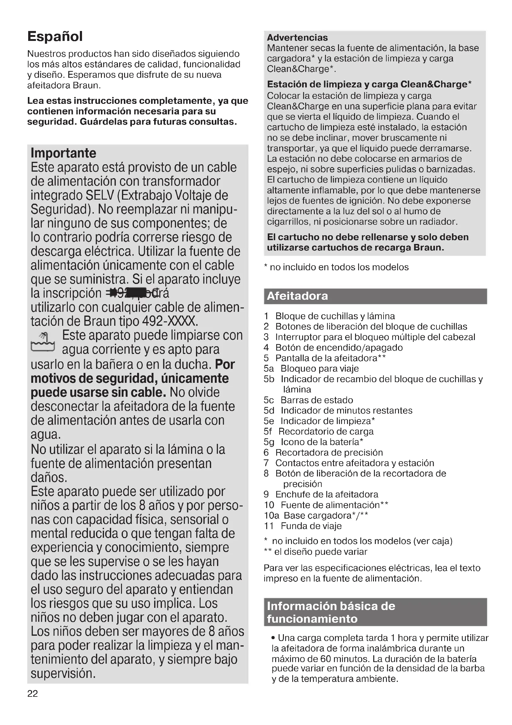 démarrage. Augmentation de la consommation de liquide de nettoyage. L’orifice de la station Clean& Charge est bouché. – Nettoyez l’orifice avec un cure-dent en bois. – Nettoyez régulièrement le bac de nettoyage. Garantie Nous accordons une garantie de 2 ans sur ce produit, à partir de la date d’achat. Pendant la durée de la garantie, Braun prendra gratuitement à sa charge la réparation des vices de fabrication ou de matière en se réservant le droit de décider si certaines pièces doivent être réparées ou si l’appareil lui-même doit être échangé. Cette garantie s’étend à tous les pays où cet appareil est commercialisé par Braun ou son distributeur exclusif. Cette garantie ne couvre pas : les dommages occasionnés par une utilisation inadéquate, l’usure normale (par exemple, grille et bloc-couteaux) ainsi que les défauts d’usures qui ont un effet négligeable sur la valeur ou l’utilisation de l’appareil. Cette garantie devient caduque si des réparations ont été effectuées par des personnes non agréées par Braun et si des pièces de rechange ne provenant pas de Braun ont été utilisées. Pour toute réclamation intervenant pendant la période de garantie, retournez ou rapportez l’appareil ainsi que l’attestation de garantie à votre revendeur ou à un Centre Service Agréé Braun. Veuillez vous référer à www.service.braun.com ou appeler le 0 800 944 802 (service consommateurs – service & appel gratuits) pour connaître le Centre Service Agréé Braun le plus proche de chez vous. Clause spéciale pour la France Outre la garantie contractuelle exposée ci-dessus, nos clients bénéficient de la garantie légale des vices caches prévue aux articles 1641 et suivants du Code civil. 91611492_93XXcc_W&D_MN_Type_5793_S6-76.indd 2191611492_93XXcc_W&D_MN_Type_5793_S6-76.indd 21 20.10.17 08:1620.10.17 08:16 CSS APPROVED Effective Date 23Oct2017 GMT - Printed 22Nov2017 Page 21 of 7622 Español Nuestros productos han sido diseñados siguiendo los más altos estándares de calidad, funcionalidad y diseño. Esperamos que disfrute de su nueva afeitadora Braun. Lea estas instrucciones completamente, ya que contienen información necesaria para su seguridad. Guárdelas para futuras consultas. Importante Este aparato está provisto de un cable de alimentación con transformador integrado SELV (Extrabajo Voltaje de Seguridad). No reemplazar ni manipu- lar ninguno de sus componentes; de lo contrario podría correrse riesgo de descarga eléctrica. Utilizar la fuente de alimentación únicamente con el cable que se suministra. Si el aparato incluye la inscripción 492, podrá utilizarlo con cualquier cable de alimen- tación de Braun tipo 492-XXXX. Este aparato puede limpiarse con agua corriente y es apto para usarlo en la bañera o en la ducha. Por motivos de seguridad, únicamente puede usarse sin cable. No olvide desconectar la afeitadora de la fuente de alimentación antes de usarla con agua. No utilizar el aparato si la lámina o la fuente de alimentación presentan daños. Este aparato puede ser utilizado por niños a partir de los 8 años y por perso- nas con capacidad física, sensorial o mental reducida o que tengan falta de experiencia y conocimiento, siempre que se les supervise o se les hayan dado las instrucciones adecuadas para el uso seguro del aparato y entiendan los riesgos que su uso implica. Los niños no deben jugar con el aparato. Los niños deben ser mayores de 8 años para poder realizar la limpieza y el man- tenimiento del aparato, y siempre bajo supervisión. Advertencias Mantener secas la fuente de alimentación, la base cargadora* y la estación de limpieza y carga Clean&Charge*. Estación de limpieza y carga Clean&Charge* Colocar la estación de limpieza y carga Clean&Charge en una superficie plana para evitar que se vierta el líquido de limpieza. Cuando el cartucho de limpieza esté instalado, la estación no se debe inclinar, mover bruscamente ni transportar, ya que el líquido puede derramarse. La estación no debe colocarse en armarios de espejo, ni sobre superficies pulidas o barnizadas. El cartucho de limpieza contiene un líquido altamente inflamable, por lo que debe mantenerse lejos de fuentes de ignición. No debe exponerse directamente a la luz del sol o al humo de cigarrillos, ni posicionarse sobre un radiador. El cartucho no debe rellenarse y solo deben utilizarse cartuchos de recarga Braun.