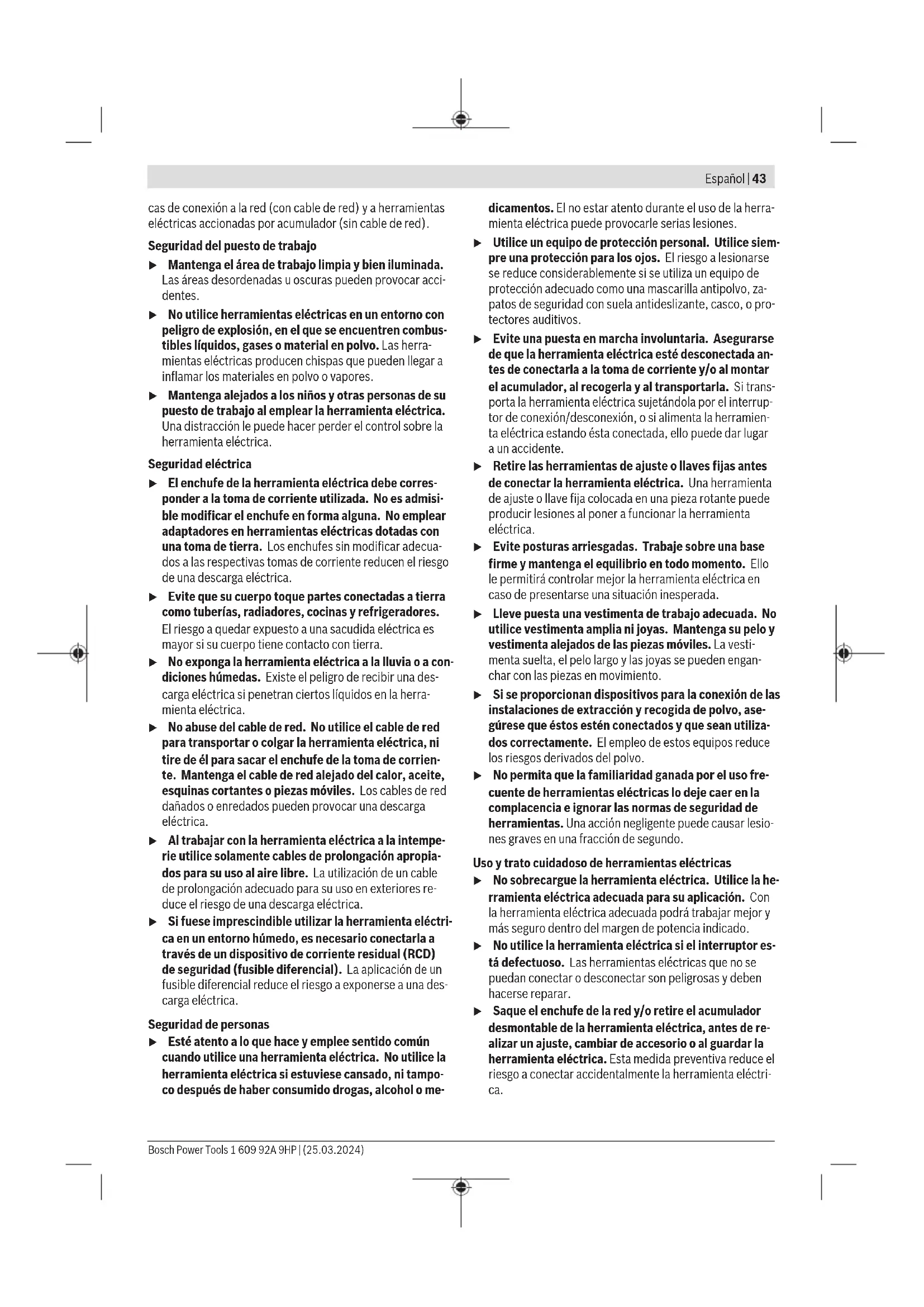 Interrupteur Marche/Arrêt avec blocage Pour mettre en marche l’outil électroportatif, appuyez d’abord sur l’interrupteur Marche/Arrêt(2) ➊ puis poussez- le vers l’avant ➋. Appuyez ensuite dessus et maintenez-le enfoncé ➌. Pour bloquer l’interrupteur Marche/Arrêt(2) en position en- foncée, poussez l’interrupteur Marche/Arrêt(2) encore plus vers l’avant ➍. Pour arrêter l’outil électroportatif, relâchez l’interrupteur Marche/Arrêt(2). S’il est bloqué, appuyez brièvement sur l’interrupteur Marche/Arrêt(2) puis relâchez-le. Interrupteur Marche/Arrêt sans blocage Pour mettre en marche l’outil électroportatif, appuyez d’abord sur l’interrupteur Marche/Arrêt(2) ➊ puis poussez- le vers l’avant ➋. Appuyez ensuite dessus et maintenez-le enfoncé ➌. Pour arrêter l’outil électroportatif, relâchez l’interrupteur Marche/Arrêt(2). u Vérifiez les accessoires de meulage avant de les utili- ser. L’accessoire de meulage doit être correctement monté et doit pouvoir tourner librement. Effectuez une marche d’essai en faisant tourner l’outil à vide pendant au moins 1 minute. N’utilisez jamais des ac- cessoires de meulage qui sont endommagés, qui vibrent ou dont la rotation est irrégulière. Les acces- soires de meulage endommagés peuvent éclater et causer des blessures. Bosch Power Tools 1 609 92A 9HP | (25.03.2024)42 | Español Entretien et Service après‑vente Nettoyage et entretien u Débranchez le câble d’alimentation de la prise avant d’effectuer des travaux quels qu’il soient sur l’outil électroportatif. u Tenez toujours propres l’outil électroportatif ainsi que les fentes de ventilation afin d’obtenir un travail im- peccable et sûr. u Dans la mesure du possible, utilisez toujours un aspi- rateur quand les conditions de travail sont extrêmes. Soufflez fréquemment de l’air comprimé au travers des fentes de ventilation et placez un disjoncteur dif- férentiel (PRCD) en amont. Lors du travail des métaux, il est possible que des poussières métalliques à effet conducteur se déposent à l’intérieur de l’outil. La double isolation de l’outil électroportatif risque alors d’être en- dommagée. Stockez et traitez les accessoires avec précaution. Dans le cas où il s’avère nécessaire de remplacer le câble d’alimentation, confiez le remplacement à Bosch ou une sta- tion de Service Après-Vente agréée pour outillage Bosch afin de ne pas compromettre la sécurité. Bac récupérateur de poussière Nous recommandons de nettoyer le bac récupérateur de poussière(3) quotidiennement après utilisation ou à inter- valles réguliers pour garantir une protection optimale contre la poussière. Les intervalles de nettoyage dépendent de la fréquence d’utilisation. Service après-vente et conseil utilisateurs Notre Service après-vente répond à vos questions concer- nant la réparation et l’entretien de votre produit et les pièces de rechange. Vous trouverez des vues éclatées et des infor- mations sur les pièces de rechange sur le site : www.bosch-pt.com L’équipe de conseil utilisateurs Bosch se tient à votre dispo- sition pour répondre à vos questions concernant nos pro- duits et leurs accessoires. Pour toute demande de renseignement ou toute commande de pièces de rechange, précisez impérativement la réfé- rence à 10chiffres figurant sur l’étiquette signalétique du produit. France Réparer un outil Bosch n’a jamais été aussi simple, et ce, en moins de 5 jours, grâce à SAV DIRECT, notre formulaire de retour en ligne que vous trouverez sur notre site internet www.bosch-pt.fr à la rubrique Services. Vous y trouverez également notre boutique de pièces détachées en ligne où vous pouvez passer directement vos commandes. Vous êtes un utilisateur, contactez : Le Service Clientèle Bosch Outillage Electroportatif Tel.: 0970821226 (Numéro non surtaxé au prix d'un ap- pel local) E-Mail: sav.outillage-electroportatif@fr.bosch.com Vous êtes un revendeur, contactez: Robert Bosch (France) S.A.S. Service Après-Vente Electroportatif 126, rue de Stalingrad 93705 DRANCY Cédex Tel.: (01) 43119006 E-Mail: sav-bosch.outillage@fr.bosch.com Vous trouverez d'autres adresses du service après-vente sous: www.bosch-pt.com/serviceaddresses Élimination des déchets Les outils électroportatifs, ainsi que leurs accessoires et em- ballages, doivent pouvoir suivre chacun une voie de recy- clage appropriée. Ne jetez pas les outils électroportatifs avec les ordures ménagères! Seulement pour les pays de l’UE : Les outils électroportatifs usagés doivent être mis au rebut séparément. Utilisez les systèmes de collecte prévus. En cas de non-respect des consignes d’élimination, les dé- chets d’équipements électriques et électroniques peuvent avoir un impact négatif sur l’environnement et la santé des personnes du fait des substances dangereuses qu’ils contiennent. Valable uniquement pour la France: Español Indicaciones de seguridad Indicaciones generales de seguridad para herramientas eléctricas ADVERTEN- CIA Lea íntegramente las advertencias de peligro, las instrucciones, las ilustraciones y las especificacio- nes entregadas con esta herramienta eléctrica. En caso de no atenerse a las instrucciones siguientes, ello puede ocasionar una descarga eléctrica, un incendio y/o una lesión grave. Guardar todas las advertencias de peligro e instruccio- nes para futuras consultas. El término "herramienta eléctrica" empleado en las siguien- tes advertencias de peligro se refiere a herramientas eléctri- 1 609 92A 9HP | (25.03.2024) Bosch Power ToolsEspañol | 43 cas de conexión a la red (con cable de red) y a herramientas eléctricas accionadas por acumulador (sin cable de red). Seguridad del puesto de trabajo u Mantenga el área de trabajo limpia y bien iluminada. Las áreas desordenadas u oscuras pueden provocar acci- dentes. u No utilice herramientas eléct