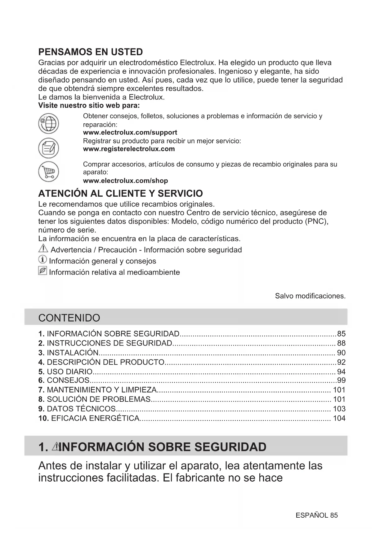 Gracias por adquirir un electrodoméstico Electrolux. Ha elegido un producto que lleva décadas de experiencia e innovación profesionales. Ingenioso y elegante, ha sido diseñado pensando en usted. Así pues, cada vez que lo utilice, puede tener la seguridad de que obtendrá siempre excelentes resultados. Le damos la bienvenida a Electrolux. Visite nuestro sitio web para:Obtener consejos, folletos, soluciones a problemas e información de servicio yreparación:www.electrolux.com/supportRegistrar su producto para recibir un mejor servicio:www.registerelectrolux.comComprar accesorios, artículos de consumo y piezas de recambio originales para suaparato:www.electrolux.com/shop