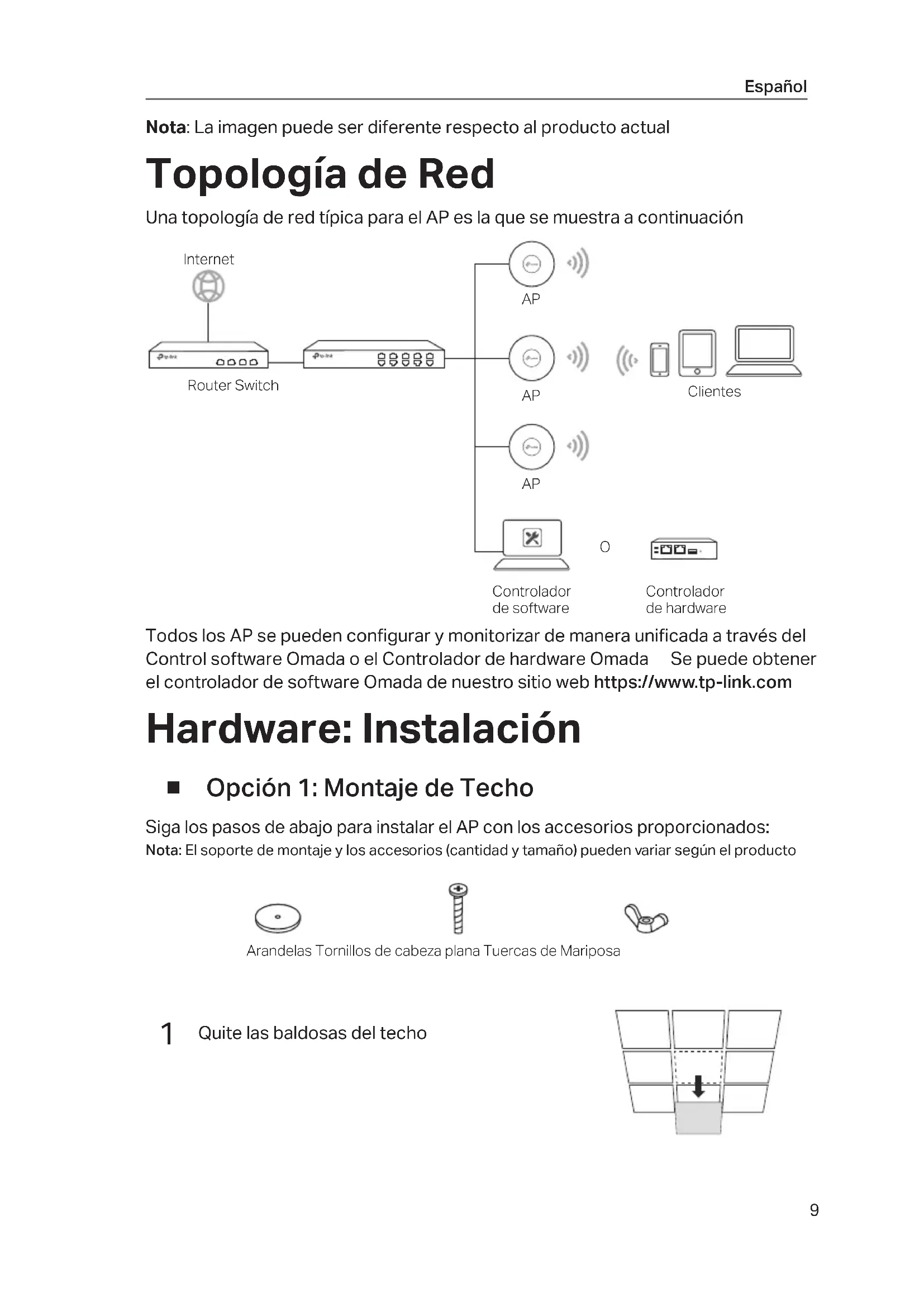 PoE LAN PoE Adapter Switch9 Español Nota: La imagen puede ser diferente respecto al producto actual Topología de Red Una topología de red típica para el AP es la que se muestra a continuación Todos los AP se pueden configurar y monitorizar de manera unificada a través del Control software Omada o el Controlador de hardware Omada Se puede obtener el controlador de software Omada de nuestro sitio web https://www.tp-link.com Hardware: Instalación ■ Opción 1: Montaje de Techo Siga los pasos de abajo para instalar el AP con los accesorios proporcionados: Nota: El soporte de montaje y los accesorios (cantidad y tamaño) pueden variar según el producto Arandelas Tornillos de cabeza plana Tuercas de Mariposa
