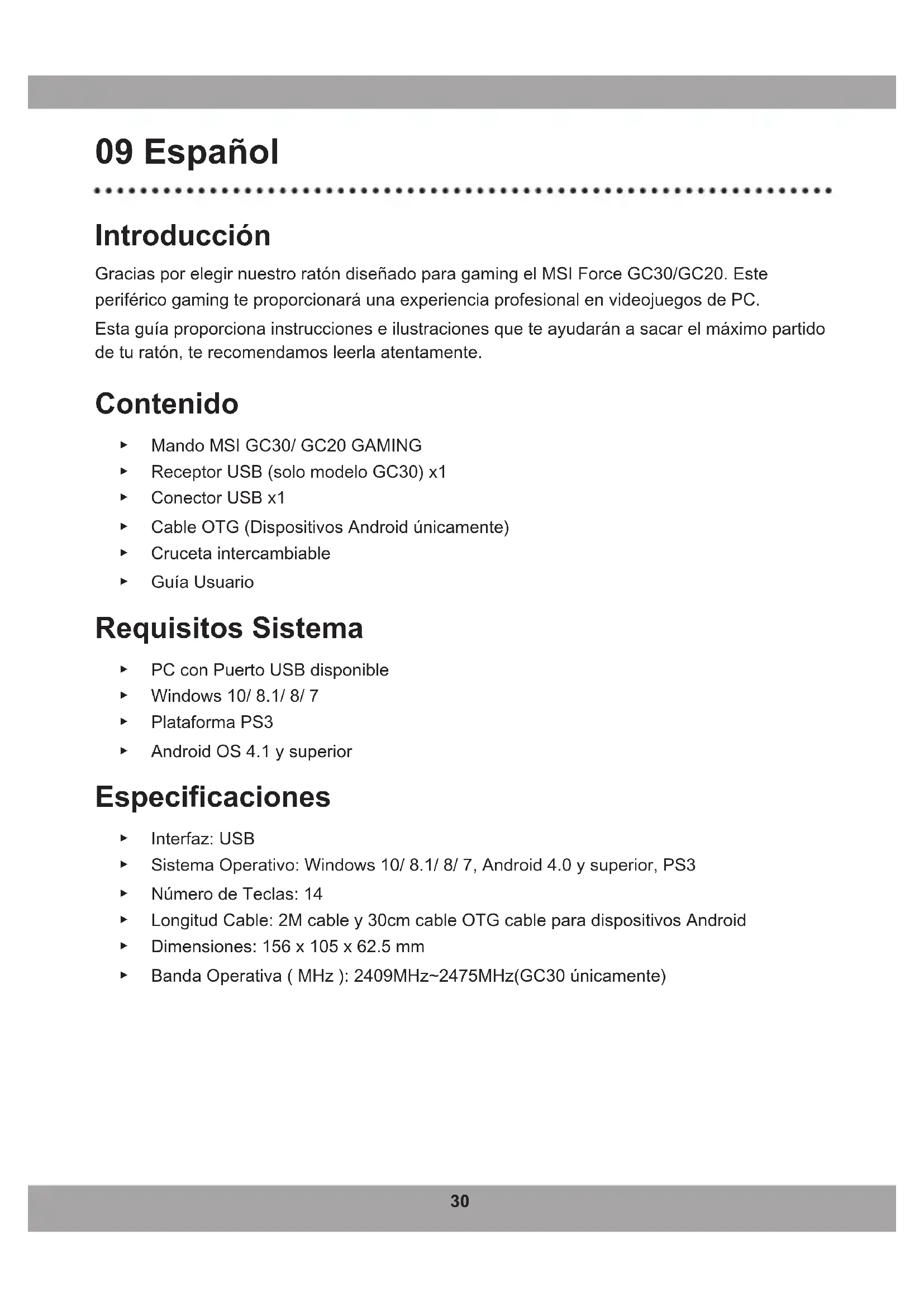 - Le3èet4èIndicateursLEDdeModes’allumentlorsquecemodeestsélectionné.30 09 Español Introducción Gracias por elegir nuestro ratón diseñado para gaming el MSI Force GC30/GC20. Este periféricogamingteproporcionaráunaexperienciaprofesionalenvideojuegosdePC. Estaguíaproporcionainstruccioneseilustracionesqueteayudaránasacarelmáximopartido de tu ratón, te recomendamos leerla atentamente. Contenido ▶ Mando MSI GC30/ GC20 GAMING ▶ Receptor USB (solo modelo GC30) x1 ▶ Conector USB x1 ▶ Cable OTG (Dispositivos Android únicamente) ▶ Cruceta intercambiable ▶ GuíaUsuario Requisitos Sistema ▶ PC con Puerto USB disponible ▶ Windows 10/ 8.1/ 8/ 7 ▶ Plataforma PS3 ▶ Android OS 4.1 y superior Especificaciones ▶ Interfaz: USB ▶ Sistema Operativo: Windows 10/ 8.1/ 8/ 7, Android 4.0 y superior, PS3 ▶ Número de Teclas: 14 ▶ Longitud Cable: 2M cable y 30cm cable OTG cable para dispositivos Android ▶ Dimensiones: 156 x 105 x 62.5 mm ▶ Banda Operativa ( MHz ): 2409MHz~2475MHz(GC30 únicamente)31 Ubicación Botones