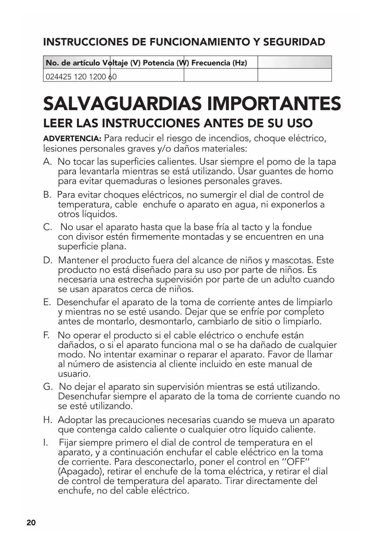 SALVAGUARDIAS IMPORTANTES LEER LAS INSTRUCCIONES ANTES DE SU USO ADVERTENCIA: Para reducir el riesgo de incendios, choque eléctrico, lesiones personales graves y/o daños materiales: A. No tocar las superficies calientes. Usar siempre el pomo de la tapa para levantarla mientras se está utilizando. Usar guantes de horno para evitar quemaduras o lesiones personales graves. B. Para evitar choques eléctricos, no sumergir el dial de control de temperatura, cable enchufe o aparato en agua, ni exponerlos a otros líquidos. C. No usar el aparato hasta que la base fría al tacto y la fondue con divisor estén firmemente montadas y se encuentren en una superficie plana. D. Mantener el producto fuera del alcance de niños y mascotas. Este producto no está diseñado para su uso por parte de niños. Es necesaria una estrecha supervisión por parte de un adulto cuando se usan aparatos cerca de niños. E. Desenchufar el aparato de la toma de corriente antes de limpiarlo y mientras no se esté usando. Dejar que se enfríe por completo antes de montarlo, desmontarlo, cambiarlo de sitio o limpiarlo. F. No operar el producto si el cable eléctrico o enchufe están dañados, o si el aparato funciona mal o se ha dañado de cualquier modo. No intentar examinar o reparar el aparato. Favor de llamar al número de asistencia al cliente incluido en este manual de usuario. G. No dejar el aparato sin supervisión mientras se está utilizando. Desenchufar siempre el aparato de la toma de corriente cuando no se esté utilizando. H. Adoptar las precauciones necesarias cuando se mueva un aparato que contenga caldo caliente o cualquier otro líquido caliente.