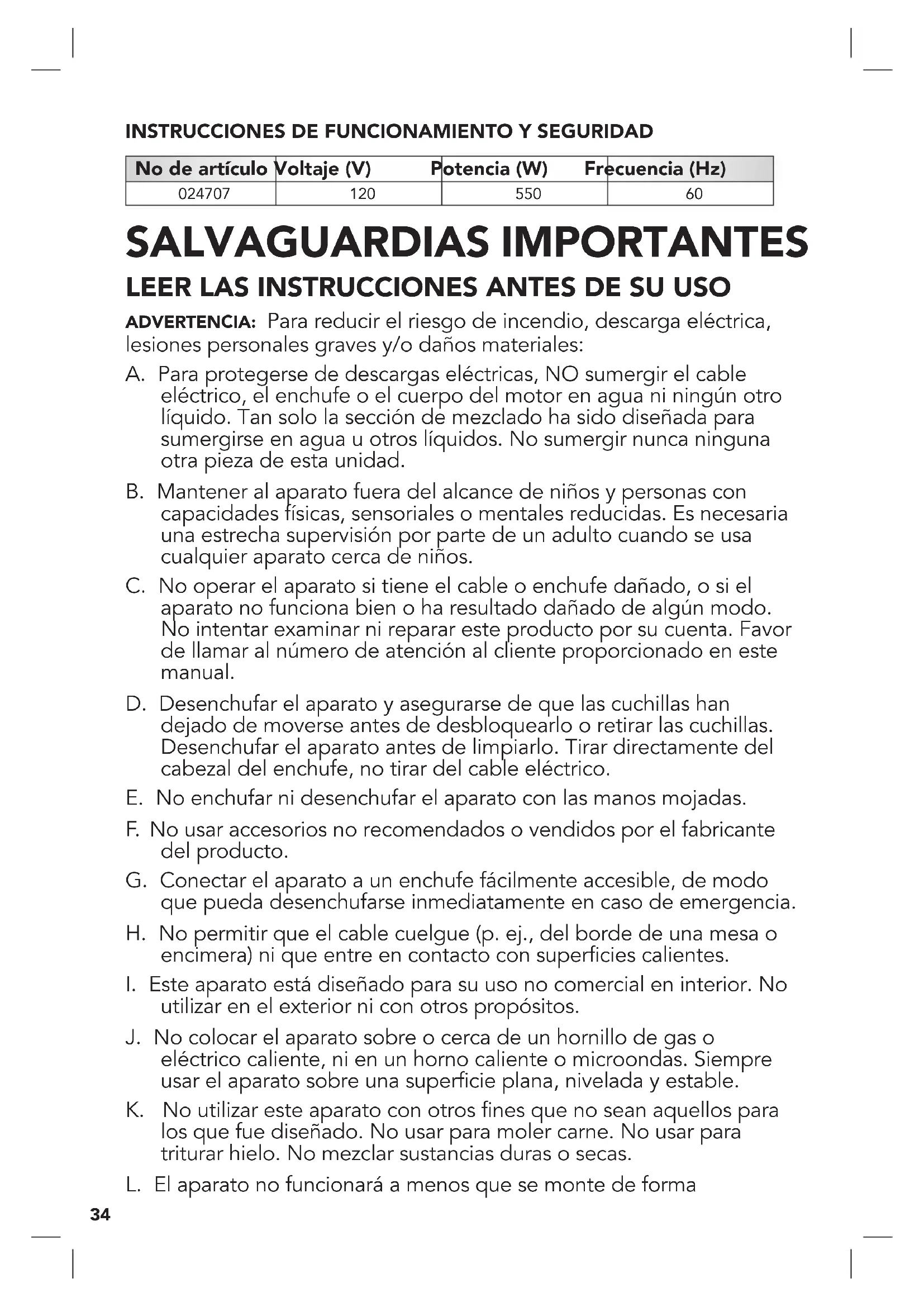 - 1 c. à thé de levure34 SALVAGUARDIAS IMPORTANTES LEER LAS INSTRUCCIONES ANTES DE SU USO ADVERTENCIA: Para reducir el riesgo de incendio, descarga eléctrica, lesiones personales graves y/o daños materiales: A. Para protegerse de descargas eléctricas, NO sumergir el cable eléctrico, el enchufe o el cuerpo del motor en agua ni ningún otro líquido. Tan solo la sección de mezclado ha sido diseñada para sumergirse en agua u otros líquidos. No sumergir nunca ninguna otra pieza de esta unidad. B. Mantener al aparato fuera del alcance de niños y personas con capacidades físicas, sensoriales o mentales reducidas. Es necesaria una estrecha supervisión por parte de un adulto cuando se usa cualquier aparato cerca de niños. C. No operar el aparato si tiene el cable o enchufe dañado, o si el aparato no funciona bien o ha resultado dañado de algún modo. No intentar examinar ni reparar este producto por su cuenta. Favor de llamar al número de atención al cliente proporcionado en este manual. D. Desenchufar el aparato y asegurarse de que las cuchillas han dejado de moverse antes de desbloquearlo o retirar las cuchillas. Desenchufar el aparato antes de limpiarlo. Tirar directamente del cabezal del enchufe, no tirar del cable eléctrico. E. No enchufar ni desenchufar el aparato con las manos mojadas. F. No usar accesorios no recomendados o vendidos por el fabricante del producto. G. Conectar el aparato a un enchufe fácilmente accesible, de modo que pueda desenchufarse inmediatamente en caso de emergencia. H. No permitir que el cable cuelgue (p. ej., del borde de una mesa o encimera) ni que entre en contacto con superficies calientes.