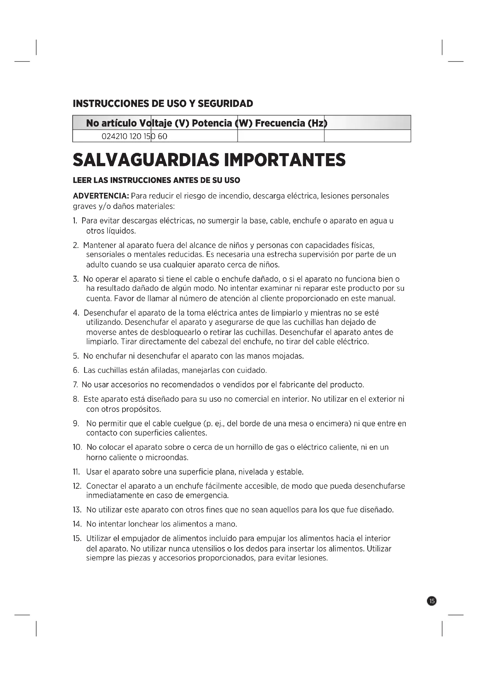 SALVAGUARDIAS IMPORTANTES LEER LAS INSTRUCCIONES ANTES DE SU USO ADVERTENCIA: Para reducir el riesgo de incendio, descarga eléctrica, lesiones personales graves y/o daños materiales: