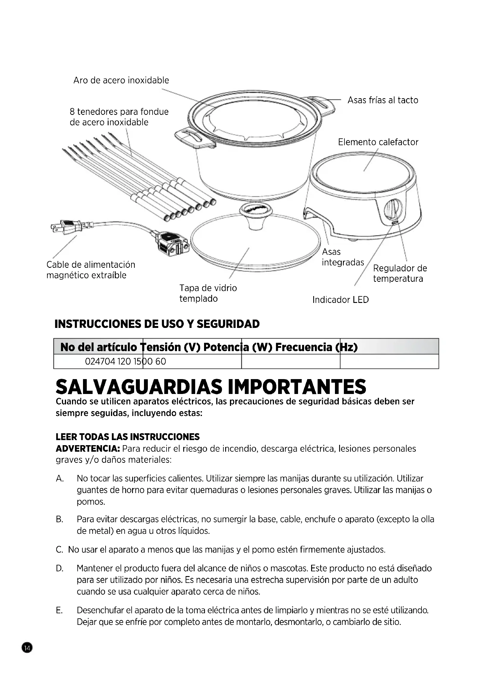 ADVERTENCIA: Para reducir el riesgo de incendio, descarga eléctrica, lesiones personales graves y/o daños materiales: A. No tocar las superficies calientes. Utilizar siempre las manijas durante su utilización. Utilizar guantes de horno para evitar quemaduras o lesiones personales graves. Utilizar las manijas o pomos. B. Para evitar descargas eléctricas, no sumergir la base, cable, enchufe o aparato (excepto la olla de metal) en agua u otros líquidos. C. No usar el aparato a menos que las manijas y el pomo estén firmemente ajustados. D. Mantener el producto fuera del alcance de niños o mascotas. Este producto no está diseñado para ser utilizado por niños. Es necesaria una estrecha supervisión por parte de un adulto cuando se usa cualquier aparato cerca de niños. E. Desenchufar el aparato de la toma eléctrica antes de limpiarlo y mientras no se esté utilizando. Dejar que se enfríe por completo antes de montarlo, desmontarlo, o cambiarlo de sitio. Asas frías al tacto 8 tenedores para fondue de acero inoxidable Regulador de temperatura Cable de alimentación magnético extraíble Tapa de vidrio templado Aro de acero inoxidable Elemento calefactor Indicador LED Asas integradas15 F. No operar el aparato si tiene el cable o enchufe dañado, o si el aparato no funciona bien o ha resultado dañado de algún modo. No intentar examinar ni reparar este producto por su cuenta. Favor de llamar al número de atención al cliente proporcionado en este manual. G. No dejar el aparato sin supervisión mientras se esté utilizando. No mover el aparato mientras se esté utilizando. H. Adoptar precauciones al mover un aparato que contenga aceite caliente o cualquier otro líquido caliente.