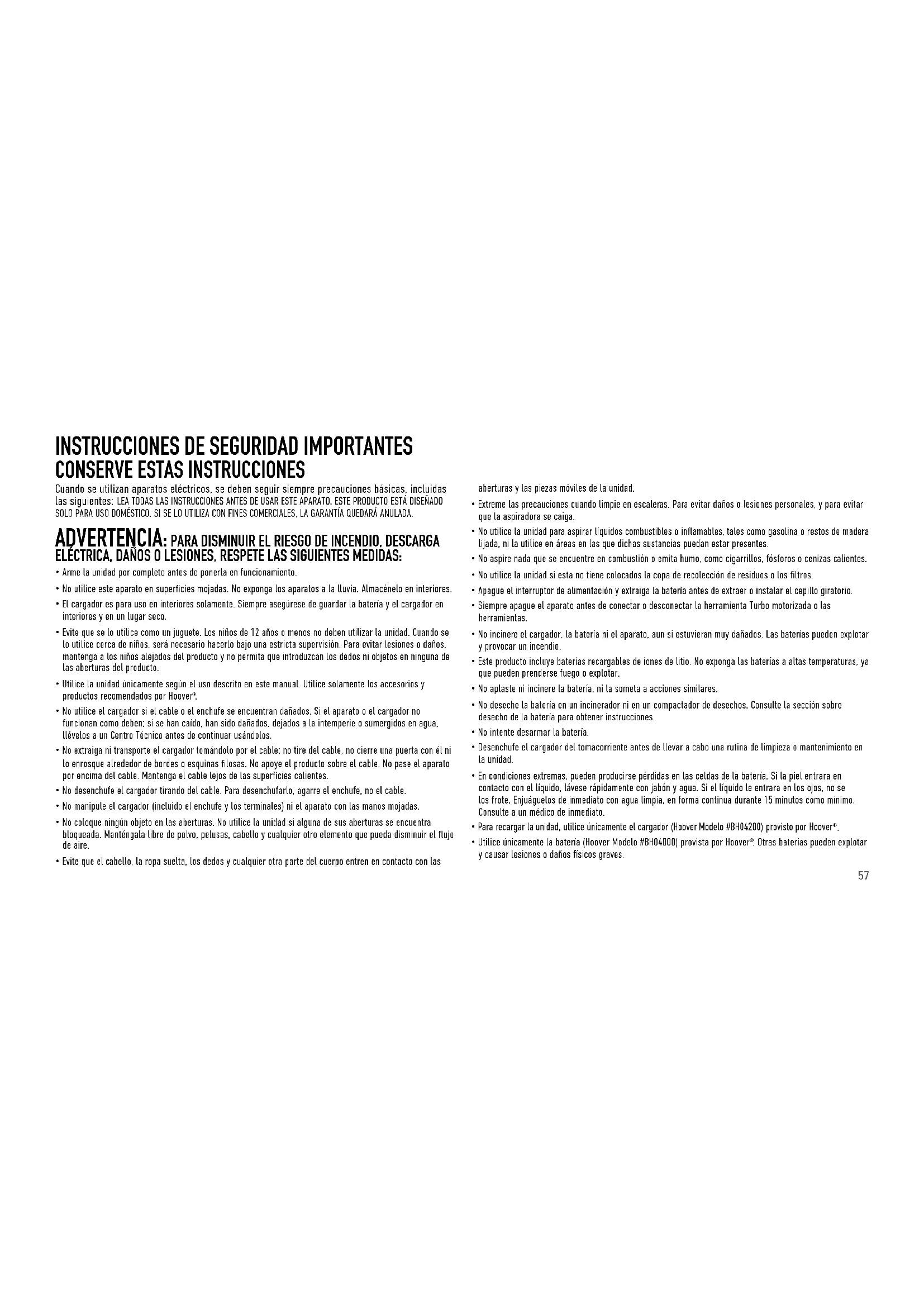 - Utilice únicamente la batería (Hoover Modelo #BH04000) provista por Hoover