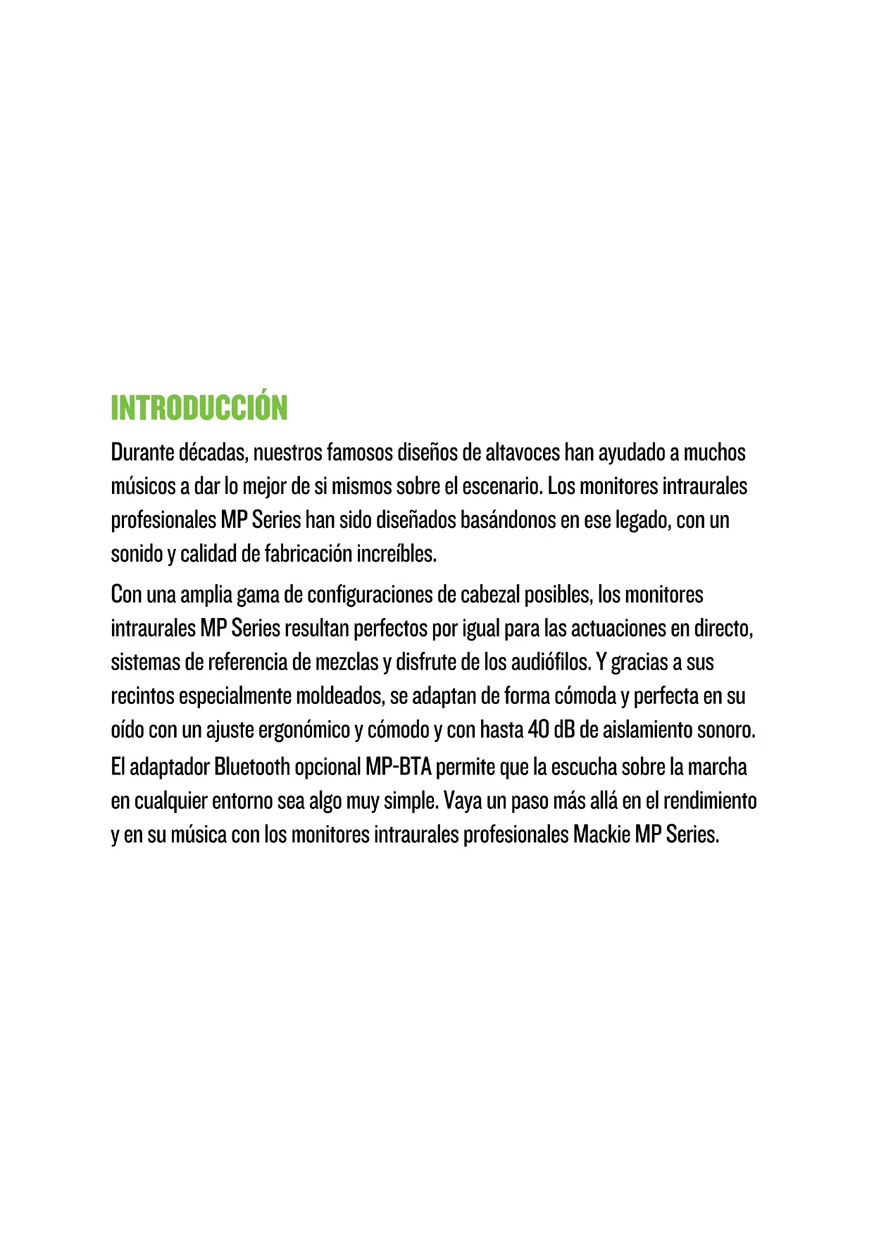 Esta garantía limitada de producto (“Garantía de producto”) es ofrecida por LOUD Audio, LLC. (“LOUD”) y es aplicable a los productos adquiridos en los Estados Unidos o Canadá a través de un distribuidor oficial LOUD. Esta Garantía de producto no cubrirá a ninguna otra persona distinta al comprador original del producto (al que haremos referencia como “Comprador”, “usted” o “tú”). Para aquellos productos adquiridos fuera de los Estados Unidos o Canadá, visite la web www.mackie.com para ver la información de su distribuidor local y sobre la cobertura en garantía ofrecida por dicho distribuidor en ese país. LOUD garantiza al comprador que el producto está libre de defectos en materiales y mano de obra bajo condiciones de uso normales durante el Periodo de Garantía. Si el producto no cumple con lo establecido en esta garantía, LOUD o su servicio técnico autorizado, a nuestra elección, reparará o sustituirá ese aparato, siempre y cuando el comprador notifique a fábrica esa situación dentro del Periodo de Garantía a través de la web: www.mackie.com o llamando al servicio técnico de LOUD en el 1.800.898.3211 (llamada gratuita en los Estados Unidos y Canadá) en horario comercial de la Costa del Pacífico, excluyendo fines de semana o vacaciones de LOUD. Conserve la factura original sellada como prueba de la fecha de compra. Es necesaria para cualquier reclamación en periodo de garantía. Para consultar todos los términos y condiciones, así como la duración concreta de la garantía de este producto, visite la www.mackie.com. La Garantía de Producto, junto con su factura o recibo y los términos y condiciones que encontrará en www. mackie.com constituyen el contrato completo y sustituyen a cualquier otro contrato anterior entre LOUD y el comprador relativo al producto en cuestión. No será válida ninguna enmienda, modificación o cambio de cualquiera de las condiciones de esta Garantía de Producto salvo que aparezca previamente en un documento oficial sellado por el fabricante y/o responsable.INTRODUCTION Depuis des années, nos enceintes et moniteurs de retour ont permis à de nombreux artistes de donner le meilleur d’eux-mêmes sur scène. Les moniteurs intra-auriculaires professionnels de la série MP offrent la même qualité sonore et de construction. Proposant un large panel de configurations de transducteurs, les moniteurs intra-auriculaires MP sont parfaits pour la scène, le studio ou simplement pour apprécier un son de haute qualité. Grâce à leur coque moulée ergonomique, ils sont particulièrement confortables et fournissent une isolation acoustique jusqu’à 40 dB. L’adapteur Bluetooth MP-BTA en option permet une écoute sans fil en toute facilité. Améliorez vos performances scéniques et votre qualité d’écoute avec les moniteurs intra-auriculaires professionnels de la série MP de Mackie.Caractéristiques CONCEPTION PROFESSIONNELLE