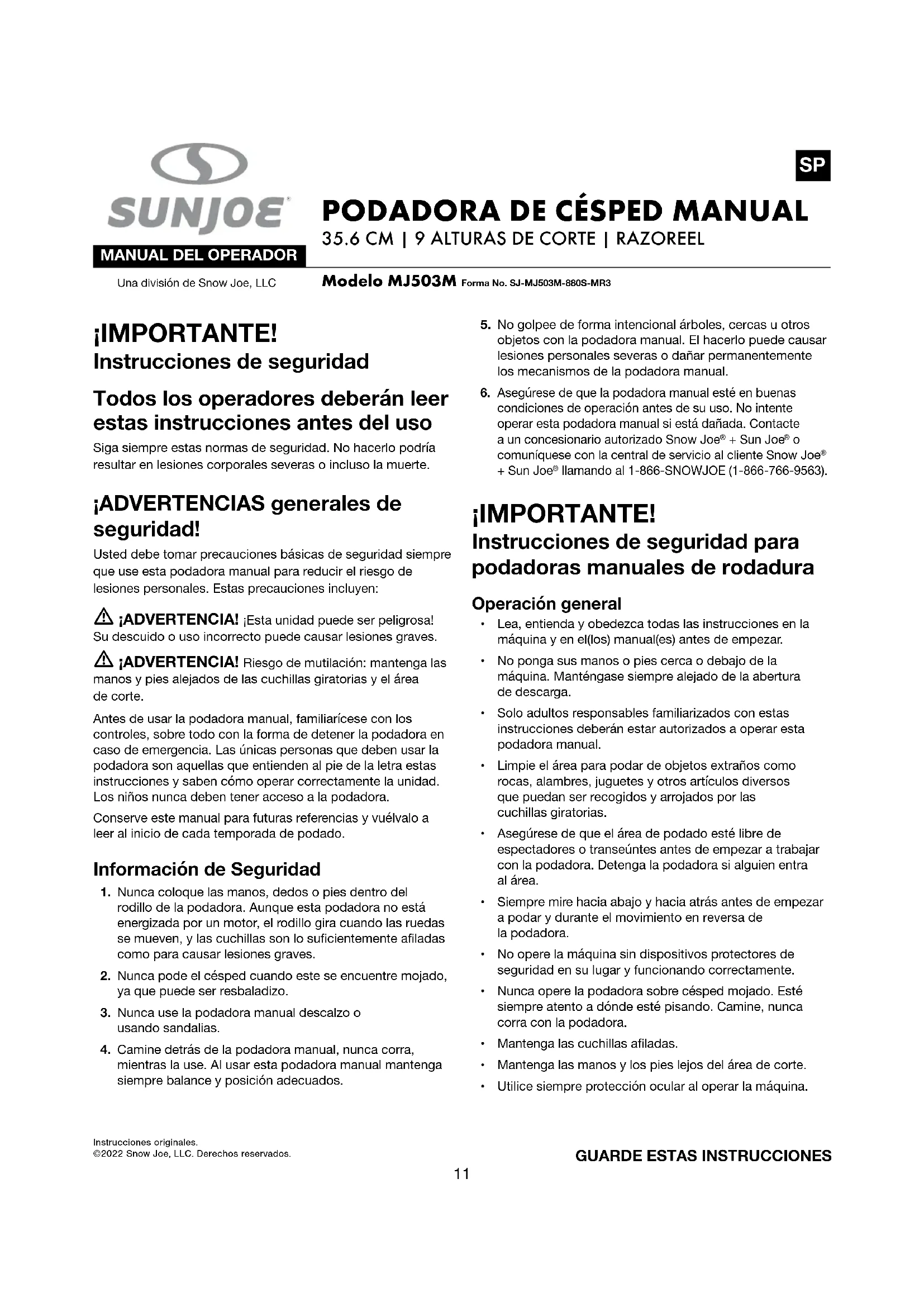 Instrucciones originales.©2022 Snow Joe, LLC. Derechos reservados. ¡IMPORTANTE! Instrucciones de seguridad Todos los operadores deberán leer estas instrucciones antes del uso Siga siempre estas normas de seguridad. No hacerlo podría resultar en lesiones corporales severas o incluso la muerte. ¡ADVERTENCIAS generales de seguridad! Usted debe tomar precauciones básicas de seguridad siempre que use esta podadora manual para reducir el riesgo de lesiones personales. Estas precauciones incluyen: m ¡ADVERTENCIA! ¡Esta unidad puede ser peligrosa! Su descuido o uso incorrecto puede causar lesiones graves. m ¡ADVERTENCIA! Riesgo de mutilación: mantenga las manos y pies alejados de las cuchillas giratorias y el área de corte. Antes de usar la podadora manual, familiarícese con los controles, sobre todo con la forma de detener la podadora en caso de emergencia. Las únicas personas que deben usar la podadora son aquellas que entienden al pie de la letra estas instrucciones y saben cómo operar correctamente la unidad. Los niños nunca deben tener acceso a la podadora. Conserve este manual para futuras referencias y vuélvalo a leer al inicio de cada temporada de podado. Información de Seguridad